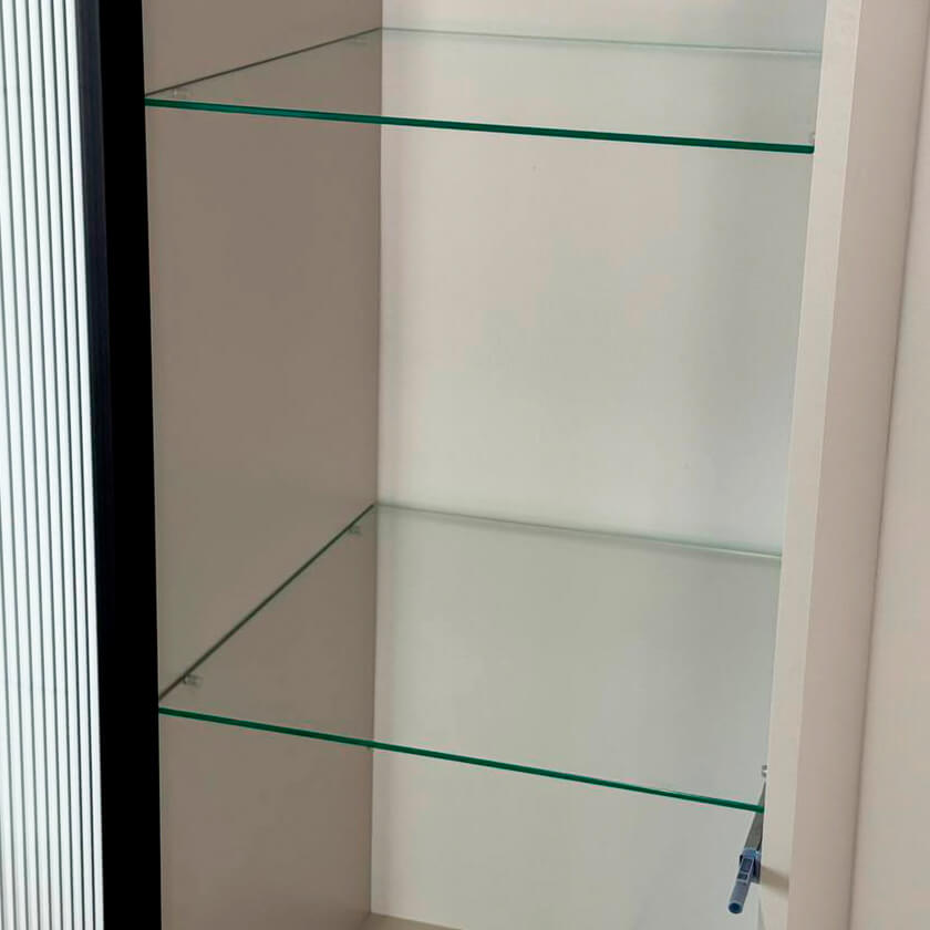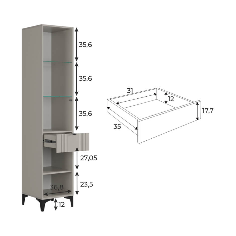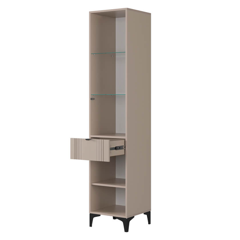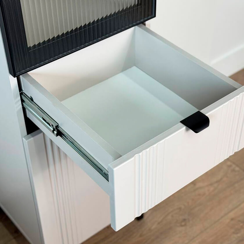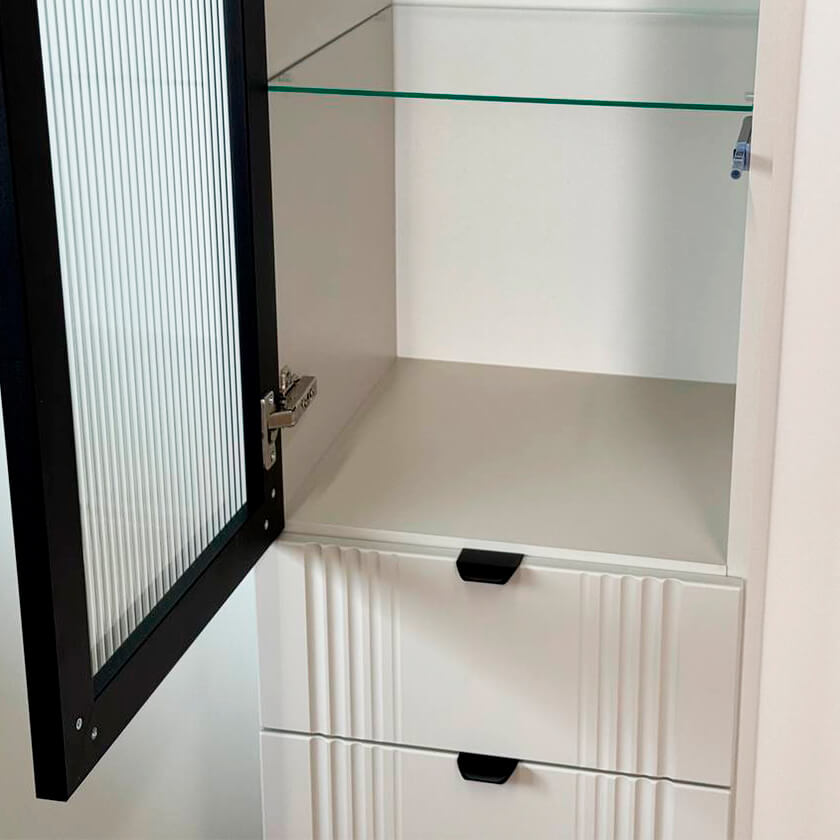 Шкаф оснащён надёжной металлической ручкой и имеет удобное внутреннее наполнение: надёжные полки за стеклянной и глухой дверцами, а также выкатной ящик. Это позволяет рационально использовать пространство.
