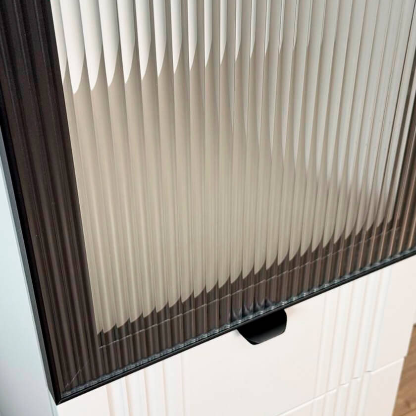 Корпус шкафа изготовлен из ЛДСП, что гарантирует прочность и долговечность. Фасад, покрытый МДФ в плёнке ПВХ, не только выглядит эстетично, но и защищает шкаф от повреждений. Особое внимание заслуживает фрезеровка фасадов, которая придаёт шкафу изысканный вид.