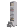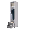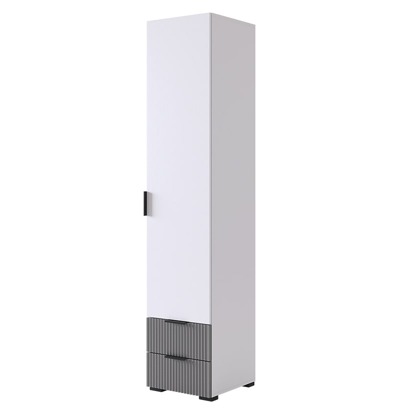 У шкафа два удобных ящика, оснащенные шариковыми направляющими для плавного и бесшумного закрывания фасадов. Благодаря универсальной сборке, можно менять открывание фасада влево или вправо. Наполнение можно менять: оставить полки или убрать их, чтобы повесить одежду на штангу.