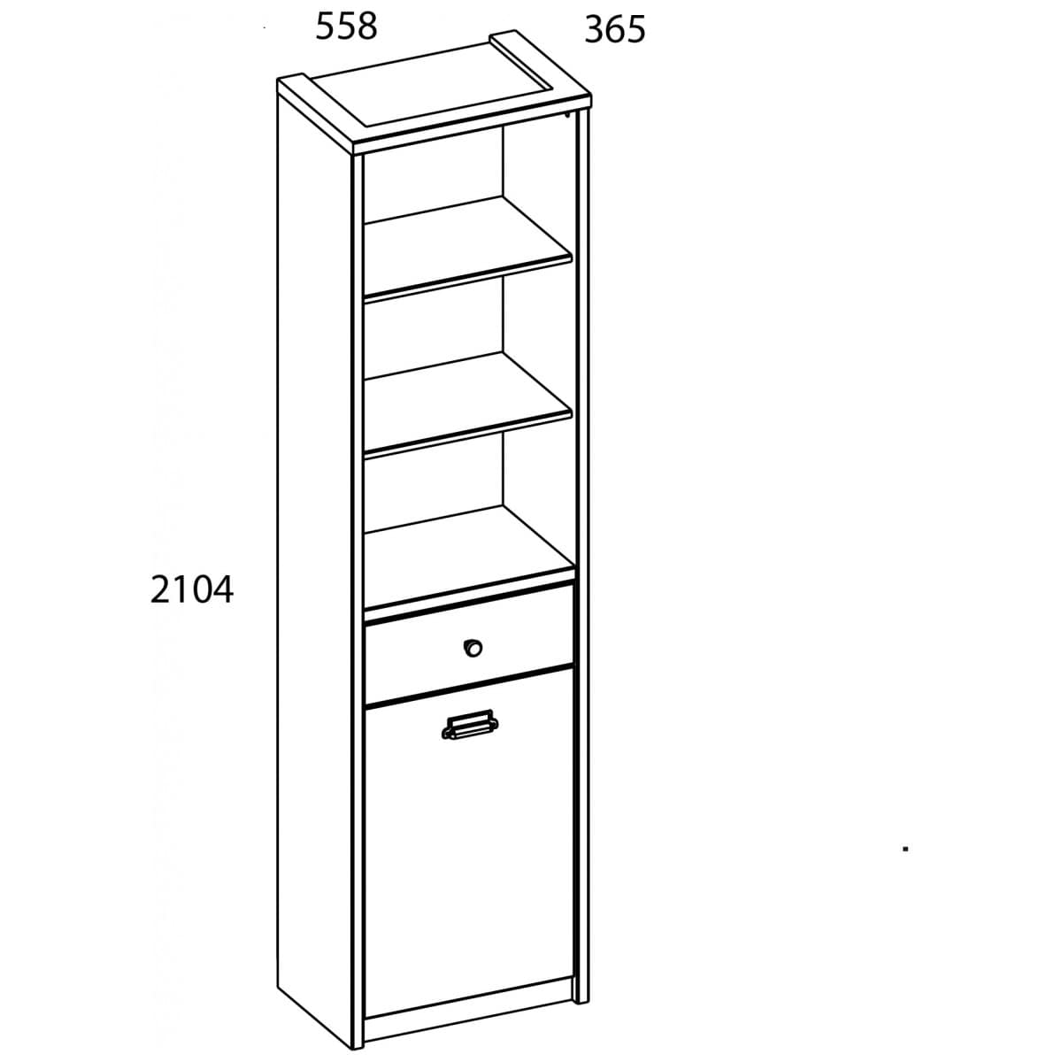 Удобное размещение рабочих и учебных материалов, предметов декора, памятных вещей в интерьере комнаты. Шкаф открытый 1D1S имеет прямую конструкцию. Конструкция элемента представляет собой одно открытое отделение с полками из ЛДСП, одно отделение с полкой из ЛДСП за глухой дверью (1D), один выдвижной ящик (1S). Дверь распашная, крепится на петли к боковому корпусу изделия.