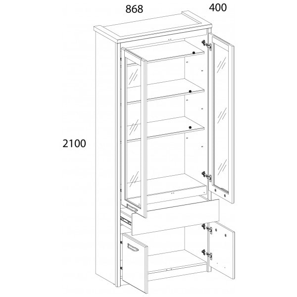 Шкаф с витриной 2V2D1S JAZZ – достойное украшение интерьера гостиной. Данный предмет организует хранение декора, книг, памятных вещей, оригинальных сувениров и красивой посуды, скатертей, салфеток и других вещей. Шкаф с витриной 2V2D1S имеет прямую конструкцию. Конструкция элемента представляет собой одно отделение с полками из ЛДСП за двумя витринами (2V), одно отделение с вместительными нишами за двумя глухими дверями (2D), один выдвижной ящик (1S). Витрины и двери распашные, крепятся на петли к боковому корпусу изделия.