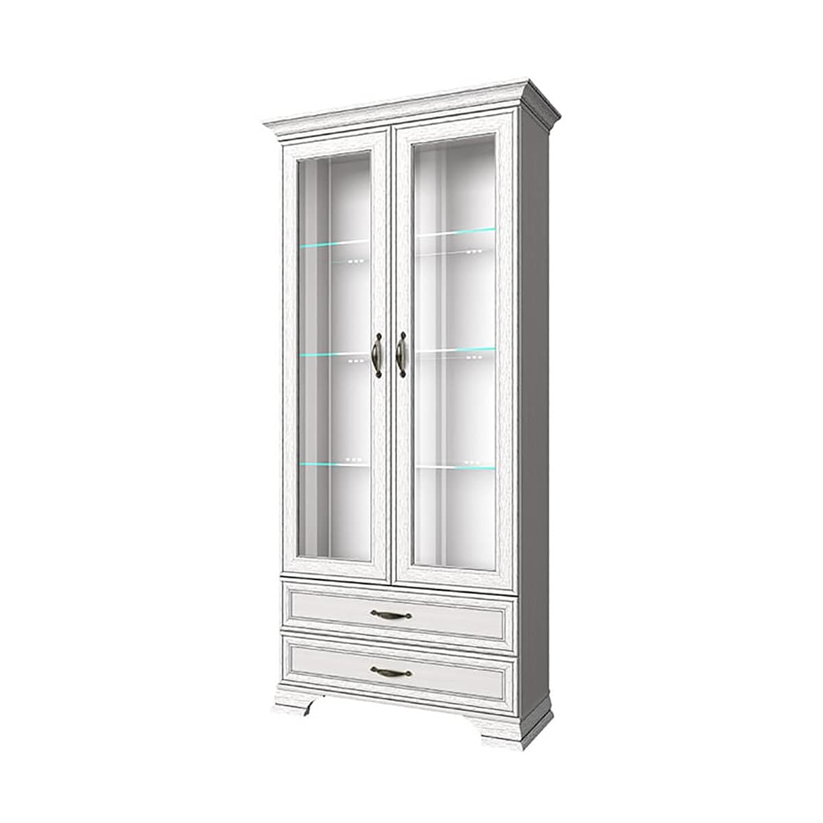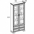 Шкаф с витриной Тиффани 2V2S. Такой предмет мебели, как шкаф с витриной 2V2S коллекции Тиффани, придаст интерьеру гостиной и столовой лёгкости и изящности. Шкаф с витриной 2V2S прямой. Представлена дополнительная комодная секция – два выдвижных ящика (2S). Конструкция элемента представляет собой одно отделение с полками из закалённого стекла (6 мм) за двумя витринами (2V – закалённое стекло – 4 мм) для хранения предметов декора, памятных вещей, книг, посуды. Выдвижные ящики организуют хранение журналов, столовых приборов, скатертей и салфеток. Витрины распашные, крепятся на петли к боковому корпусу.