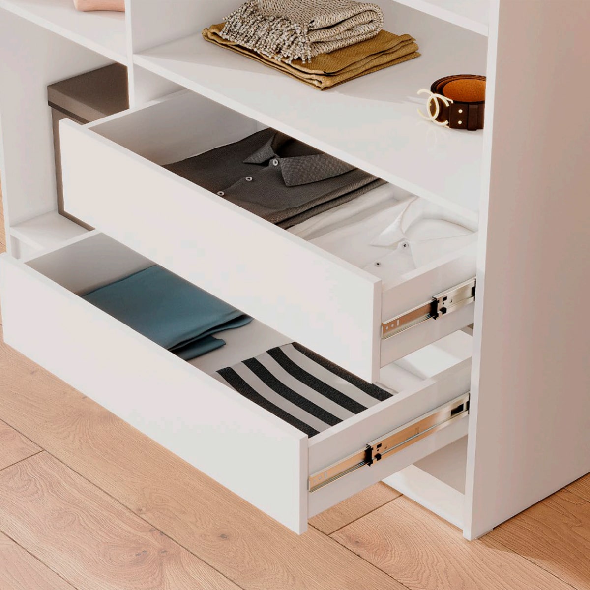 Преимуществом коллекции являются шариковые направляющие и петли со встроенным доводчиком, что обеспечивает плавное и бесшумное открывание и закрывание створок и ящиков.