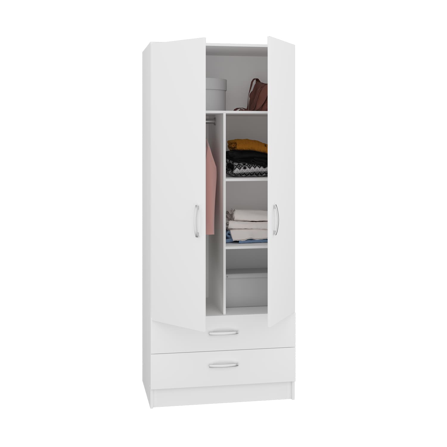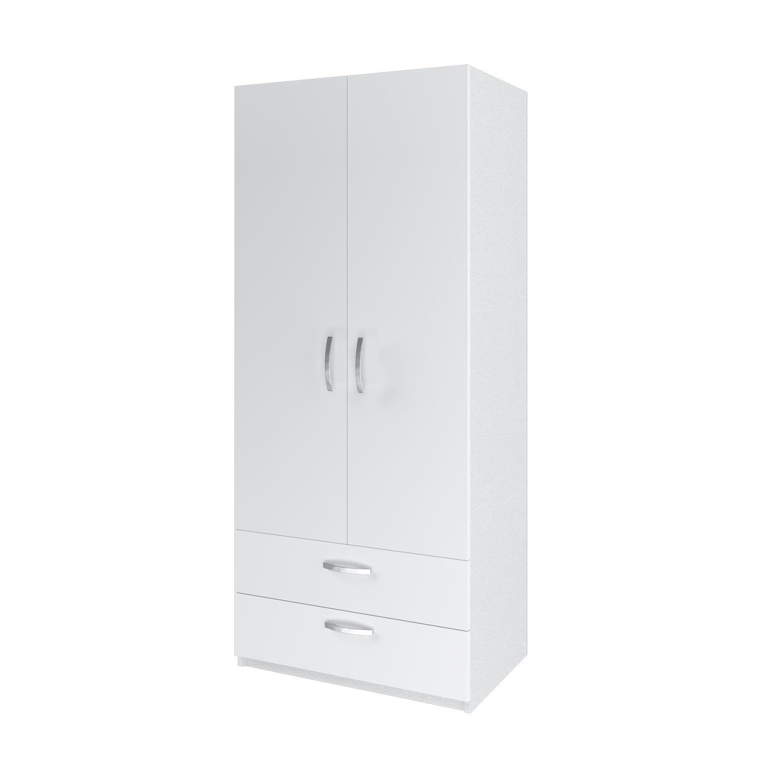 Шкаф оснащен двумя распашными дверями, за которыми находятся три полки. Это позволяет удобно разместить одежду и другие вещи. В нижней части шкафа расположены два ящика для мелочей, которые всегда будут под рукой.