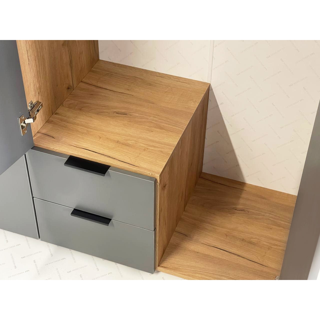 Вместительный шкаф имеет полки, ящики выдвижные и штангу для одежды, а полукруглые, обтекаемые углы обеспечат безопасность и комфорт.