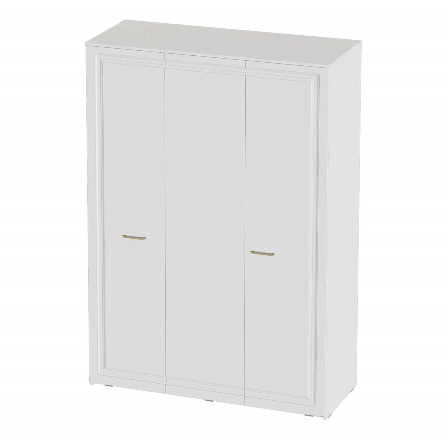Шкаф выполнен в цвете Айс 06 / Белый Аляска. Классическая фрезеровка фасадов и ручки-скобы из брашированного золота придают изделию особый шарм и элегантность. Внутреннее пространство шкафа разделено на два отделения: слева находится отделение для одежды с одной большой стационарной полкой, одной большой съёмной полкой и продольной металлической штангой; справа находится отделение с одной небольшой стационарной полкой и четырьмя съёмными полками. Двери шкафа оснащены петлями с амортизаторами.