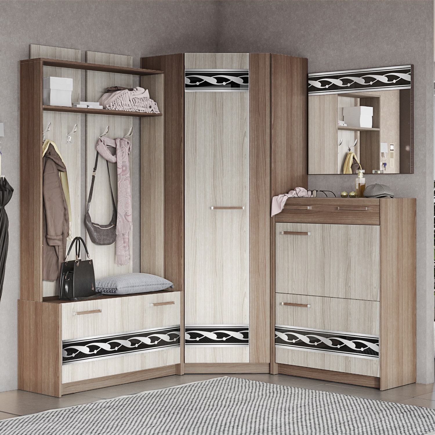 Угловой шкаф "Марица" - пример практичного и стильного дизайна. Такой шкаф будет удобно расположить в углу вашей прихожей, что позволит сэкономить много места и обеспечит вас функциональностью.