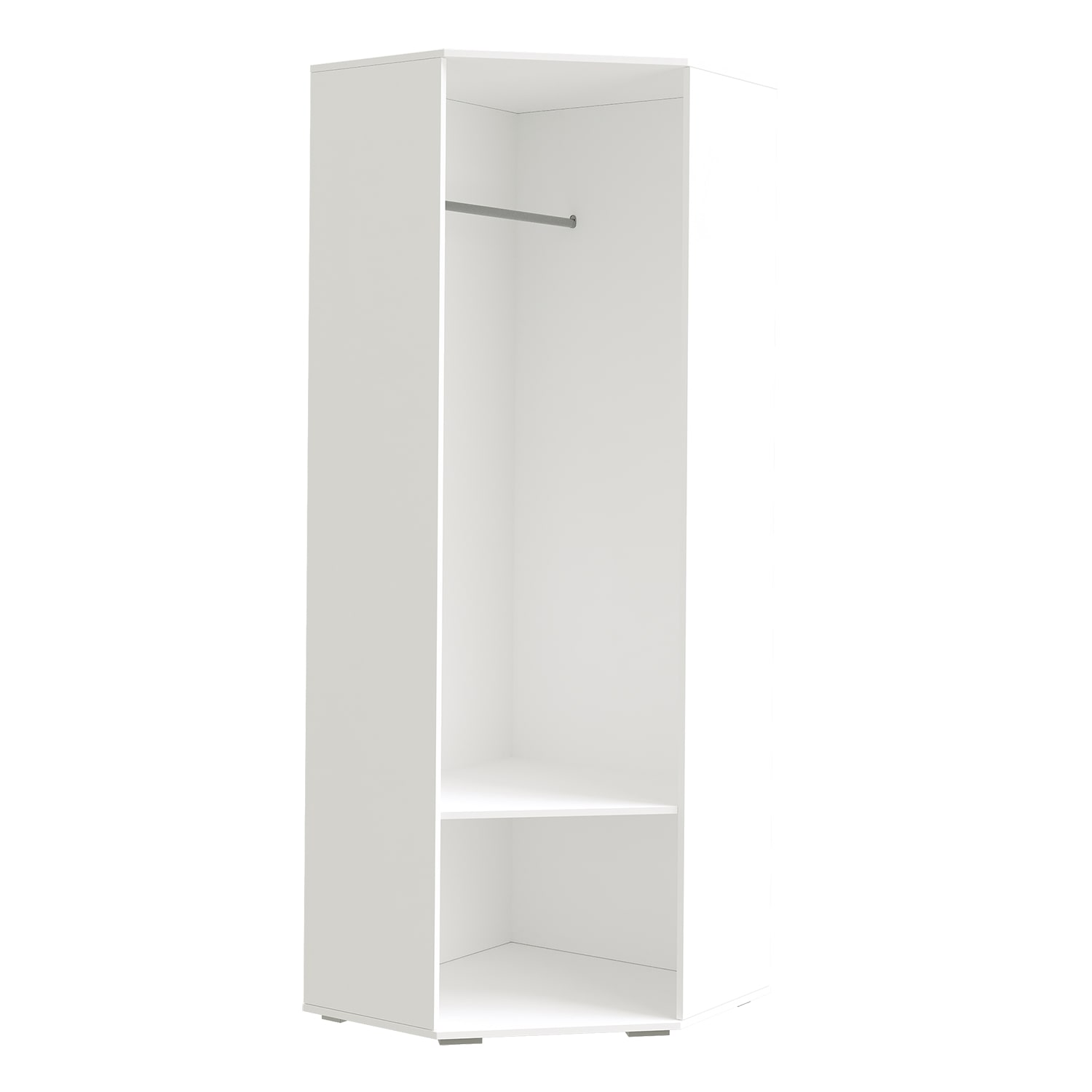 Угловая конструкция шкафа позволяет максимально эффективно использовать пространство в углу комнаты, обеспечивая компактное и функциональное размещение вещей.