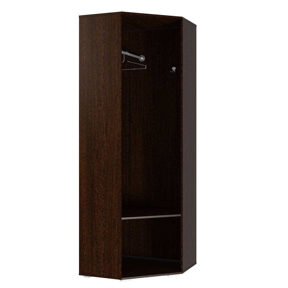 Угловая конструкция шкафа позволяет максимально эффективно использовать пространство в углу комнаты, обеспечивая компактное и функциональное размещение вещей.