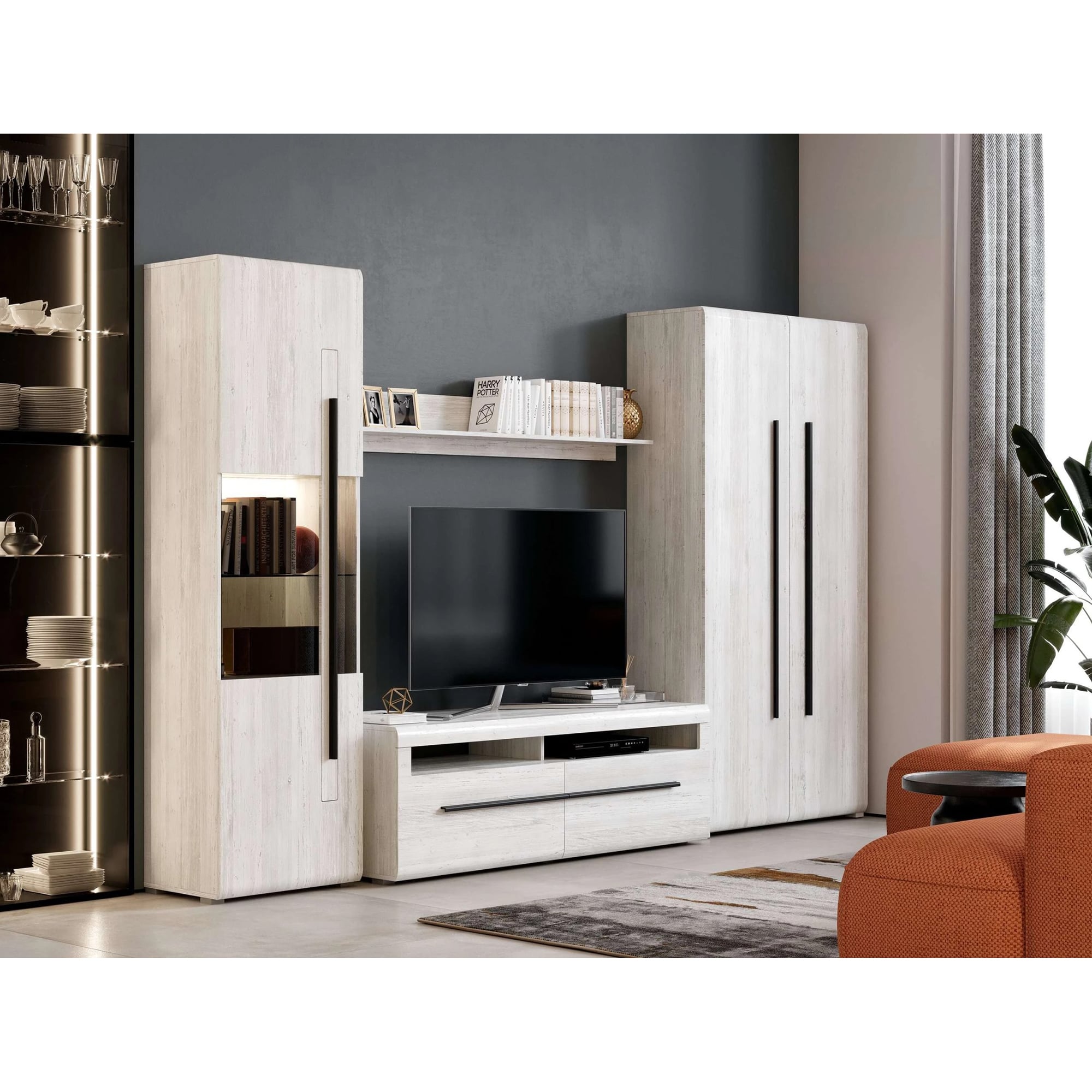 Корпус тумбы изготовлен из ЛДСП, фасады с закругленными линиями - из МДФ. Стиль изделия подчеркивает черная металлическая ручка.
