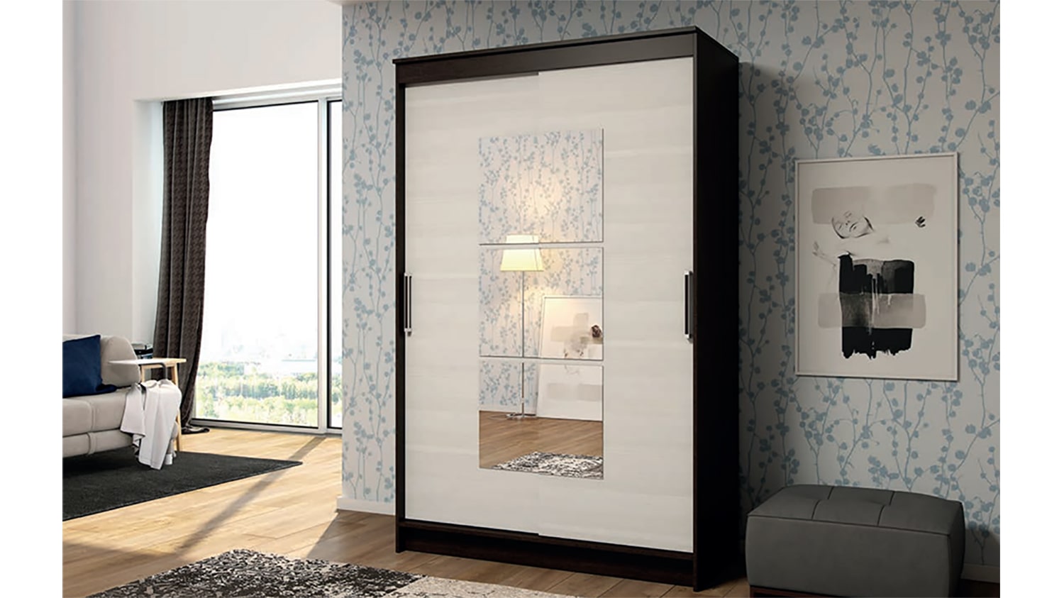 Особенностью шкафа является наличие зеркала на фасаде. Это не только визуально увеличивает пространство, но и добавляет изысканности в общий дизайн.