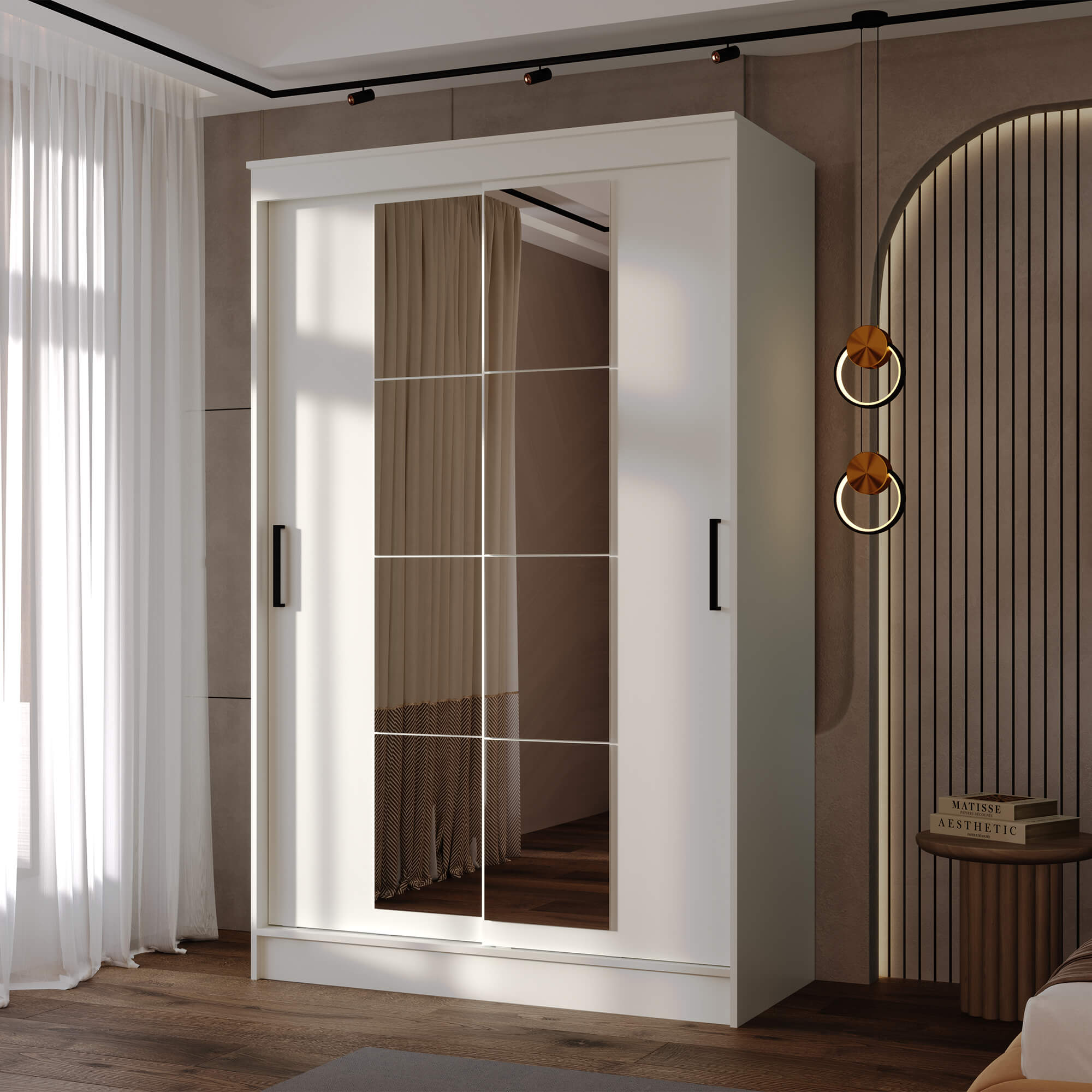 Особенностью шкафа является наличие зеркала на фасаде. Это не только визуально увеличивает пространство, но и добавляет изысканности в общий дизайн.