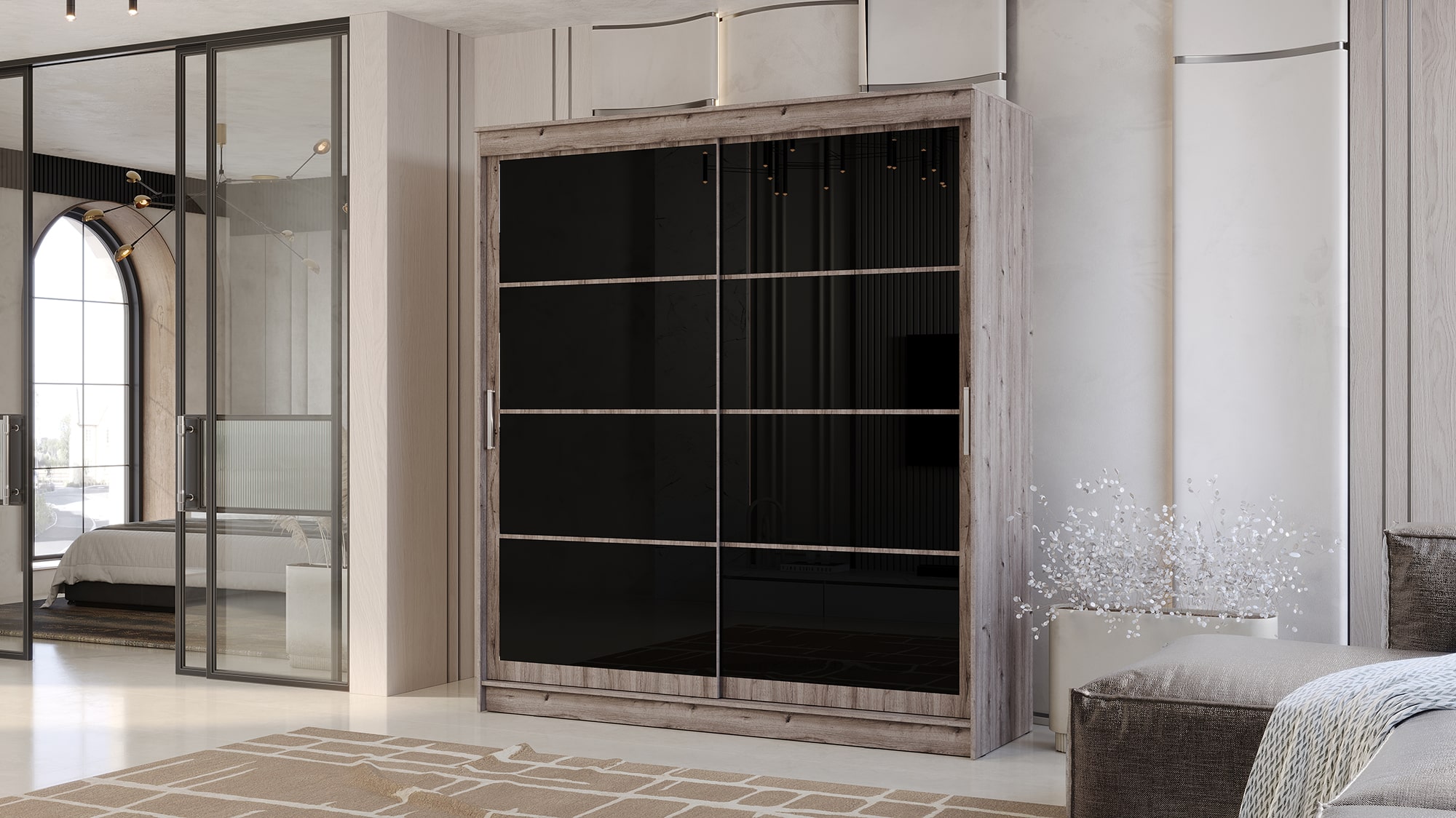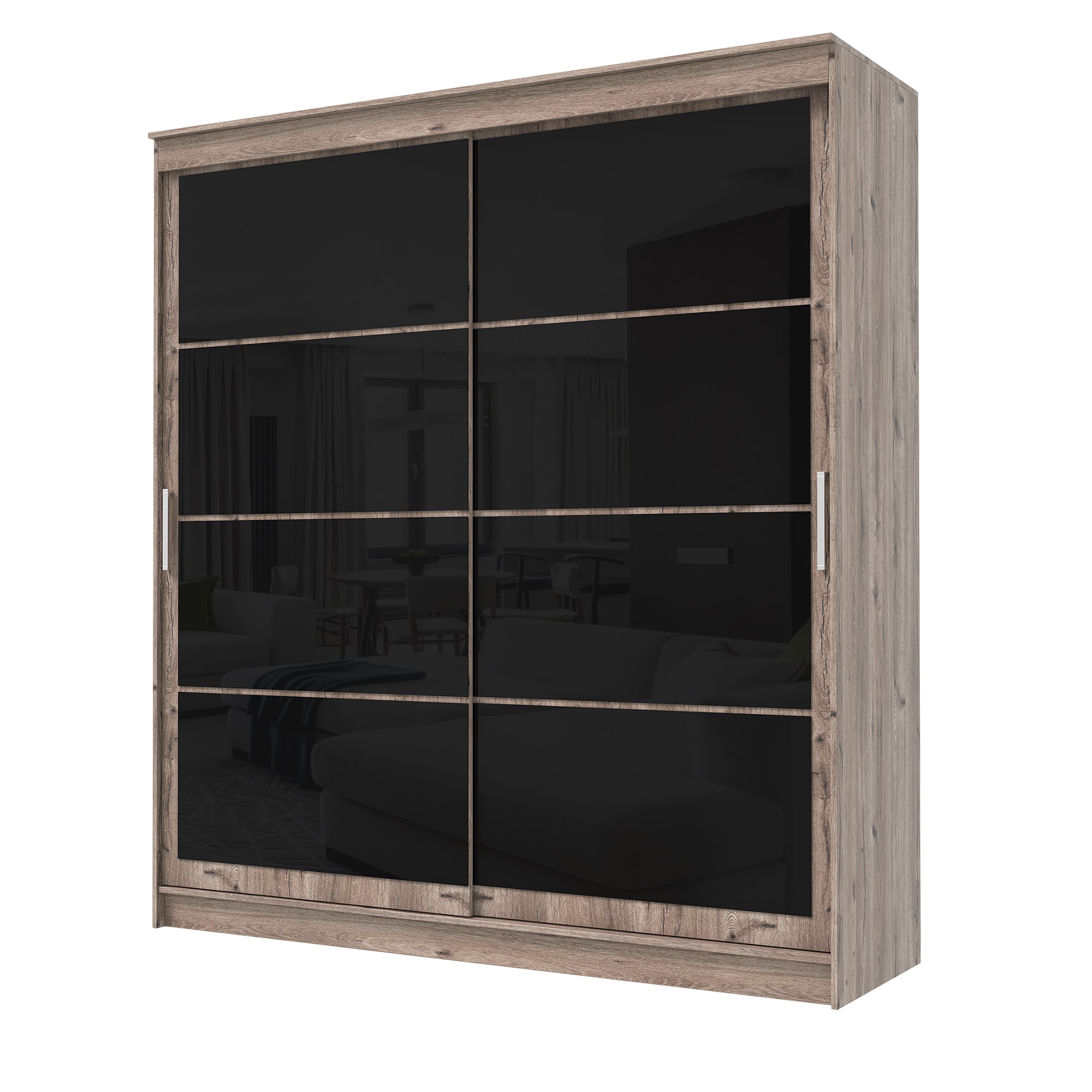 Шкаф-купе ГРАНД 1 2,0 Дуб горный/Лакобель черный доступен к заказу в различных вариантах исполнения цвета фасада и корпуса, среди которых каждый сможет найти подходящий своему интерьеру.