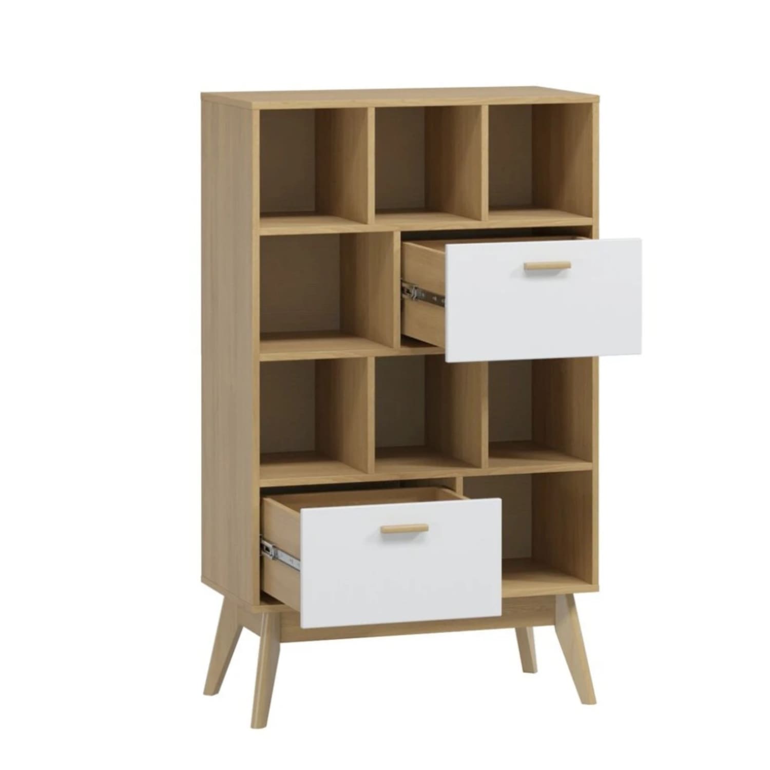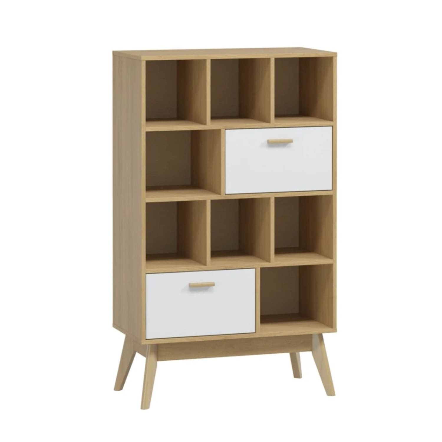 Стеллаж «Калгари» в скандинавском стиле решает проблему хранения и обеспечивает удобное размещение различных предметов. Его внутреннее пространство включает два выдвижных ящика и восемь отсеков.