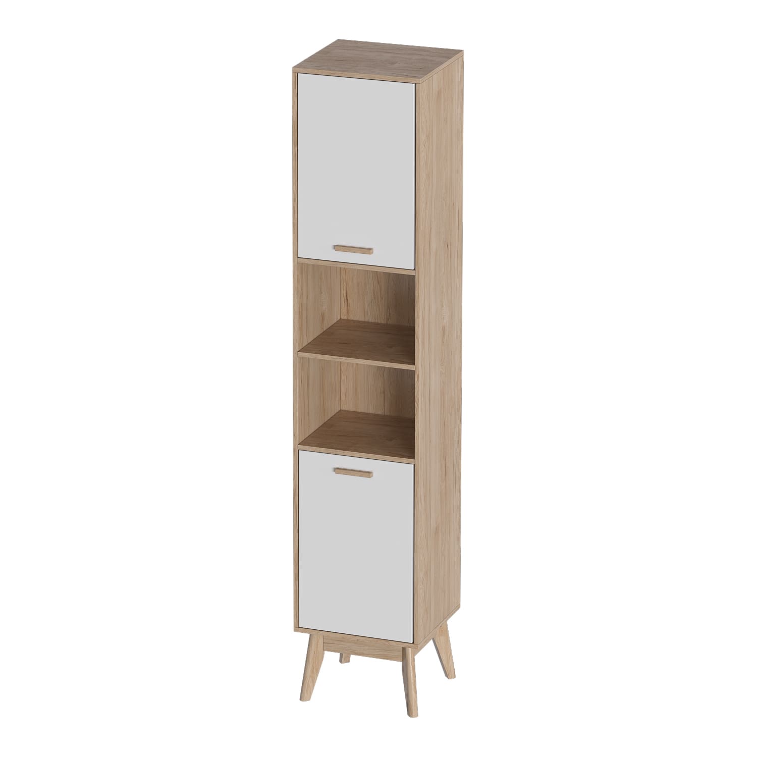 Стеллаж состоит из нескольких полок, на которых можно разместить книги, документы, фотографии и другие предметы. Он разделён на три секции вкладными боковинами: верхняя и нижняя закрыты дверцами, а в центре есть открытая полка.