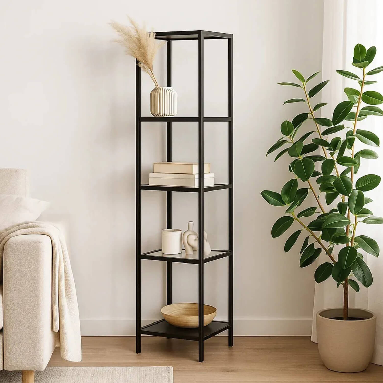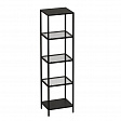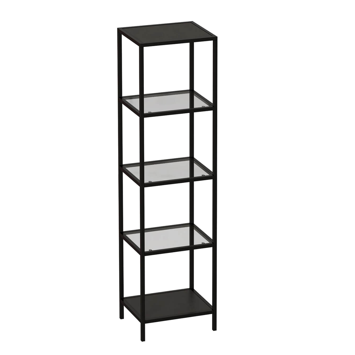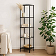 Стеллаж со стеклянными полками  "Нора". Опорой для стеллажа служит черный металлокаркас. Верхняя и нижние полки металлические. Средние выполнены из прозрачного стекла толщиной 5 мм. Опоры регулируются по высоте. Предусмотрены отверстия для фиксации к стене.