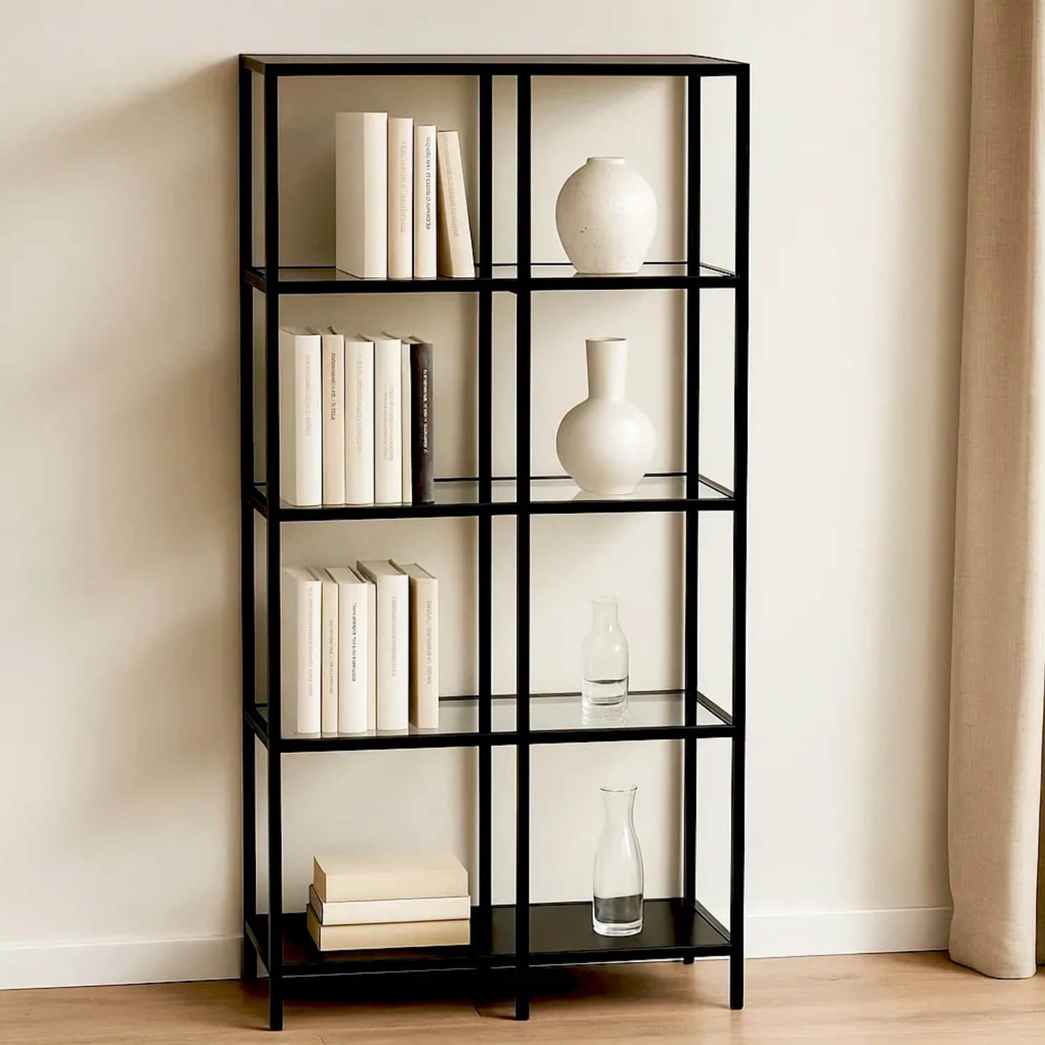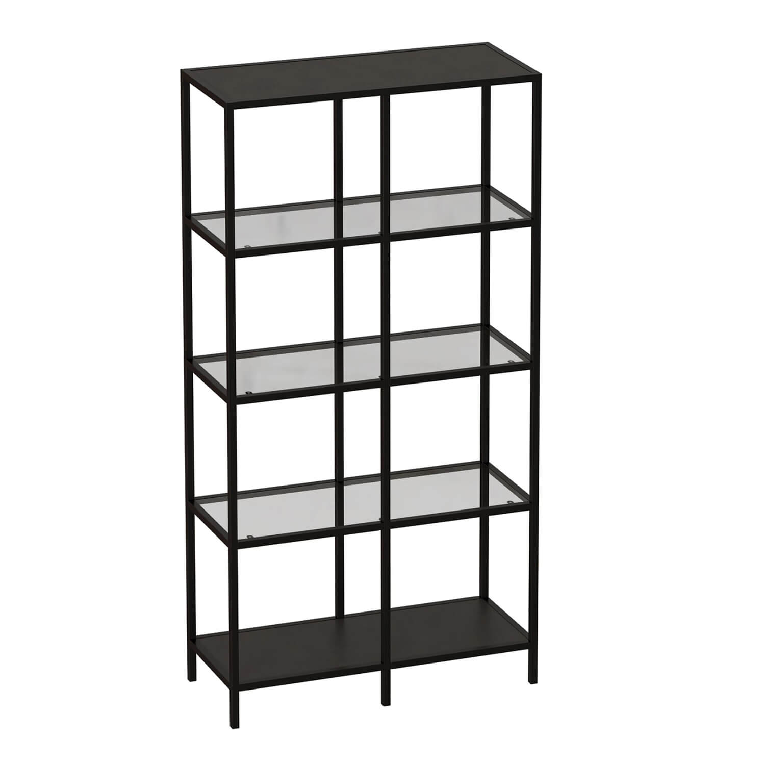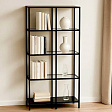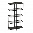 Стеллаж со стеклянными полками  "Нора". Опорой для стеллажа служит черный металлокаркас. Верхняя и нижние полки металлические. Средние выполнены из прозрачного стекла толщиной 5 мм. Опоры регулируются по высоте. Предусмотрены отверстия для фиксации к стене.