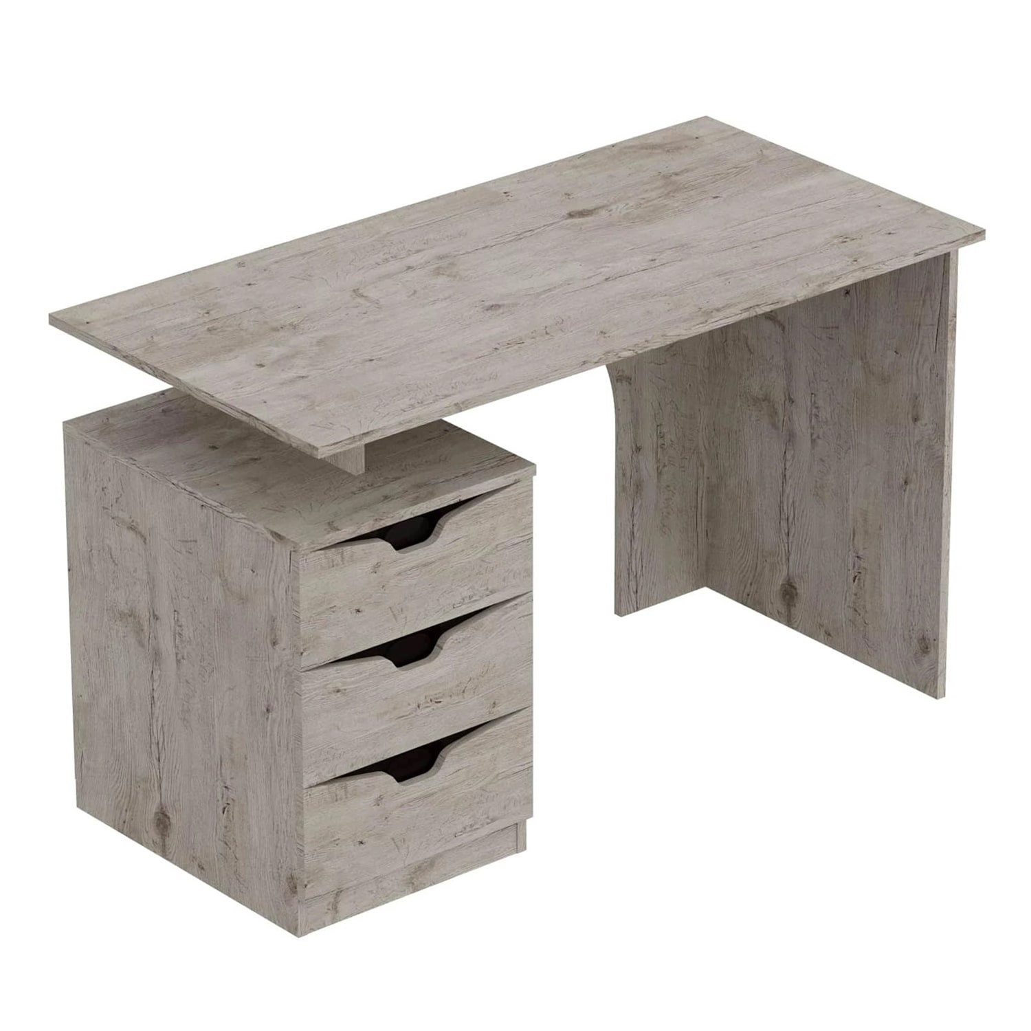 Стол изготовлен из безопасных и надёжных материалов, что обеспечивает его долговечность. Он оборудован тумбой с тремя ящиками, которые прекрасно подойдут для хранения бумаг и канцелярских принадлежностей. Кроме того, на столе достаточно места для монитора компьютера и клавиатуры. Фасад украшен декоративными вырезами, которые служат ручками.