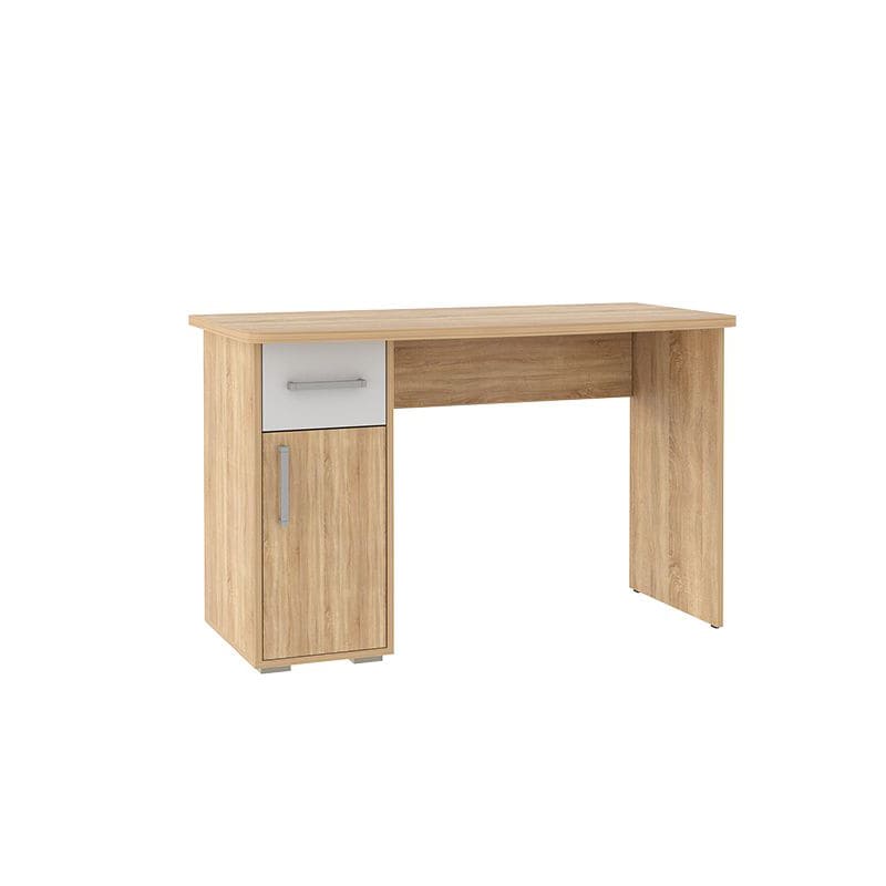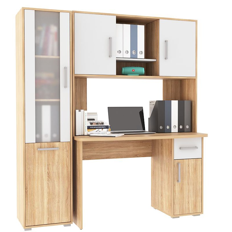 Стол выполнен из качественного материала ЛДСП в цвете дуб сонома с белыми элементами. Особенностью дизайна являются радиусные элементы и утолщенная столешница толщиной 25 мм. Для расширения функциональности стола рекомендуется дополнить его надстройкой и стеллажом из той же серии Лайт-1.