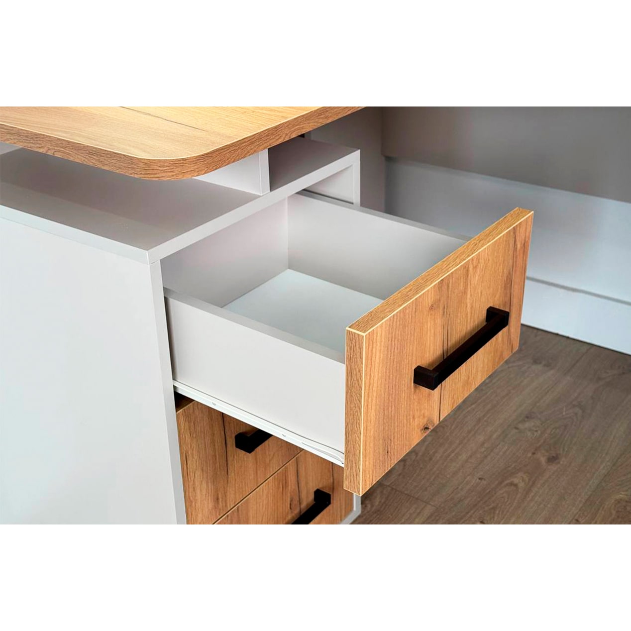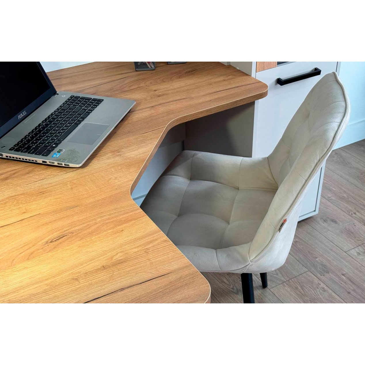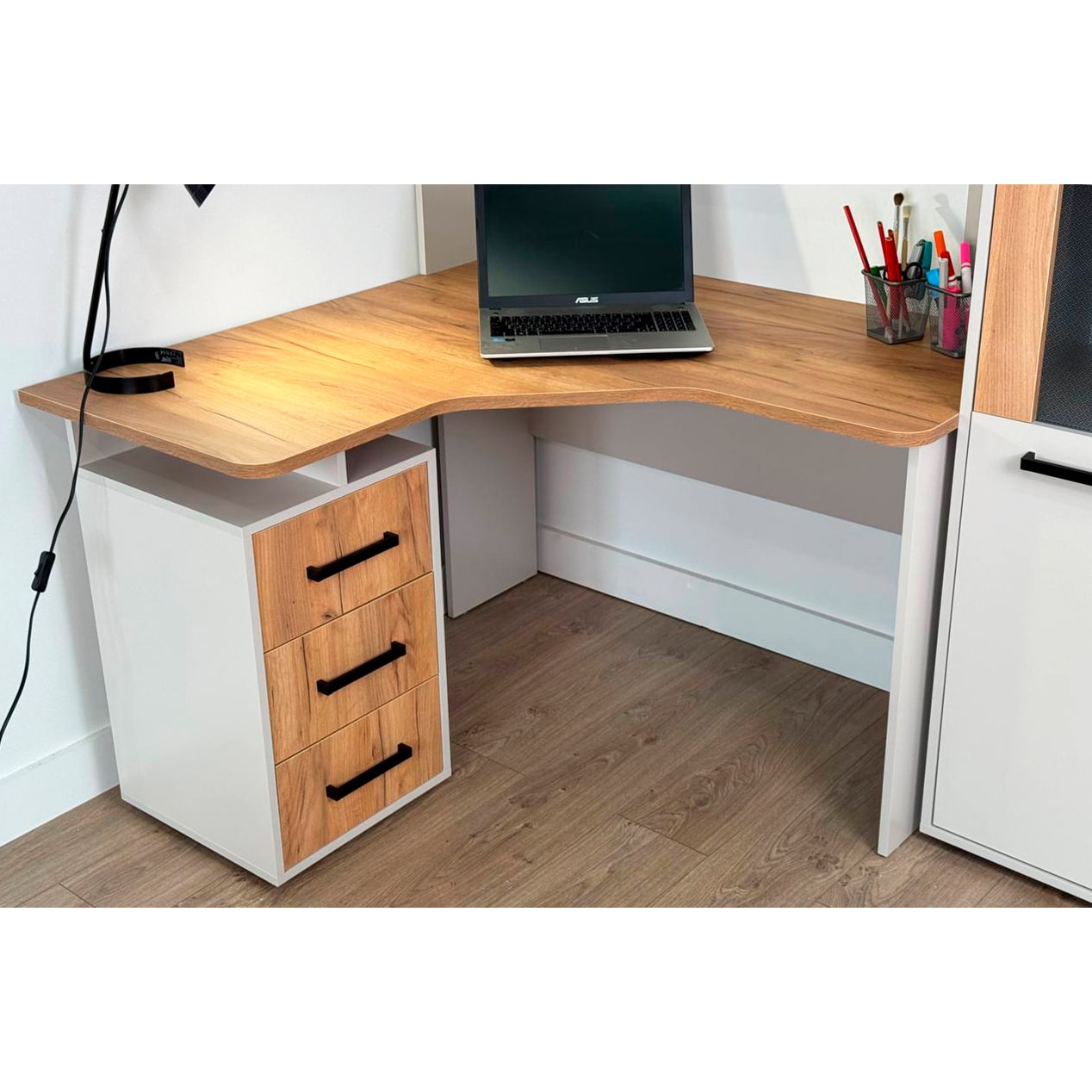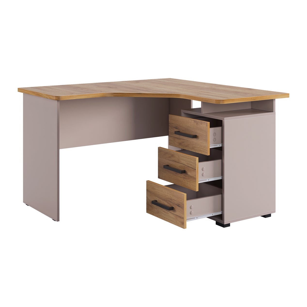 Компьютерный стол Лайт-2 угловой: элегантное и практичное решение для тех, кто ценит комфорт и функциональность. Данная модель идеально подходит для того, чтобы максимально эффективно использовать пространство и иметь всё необходимое под рукой, при этом сохраняя атмосферу стиля и уюта.
