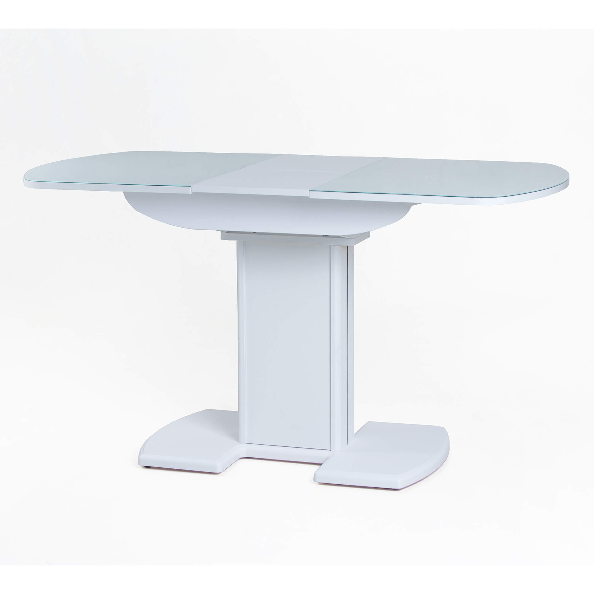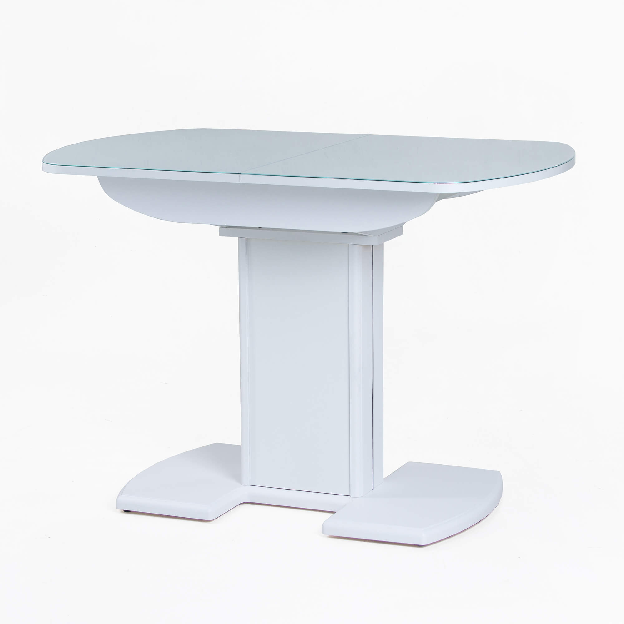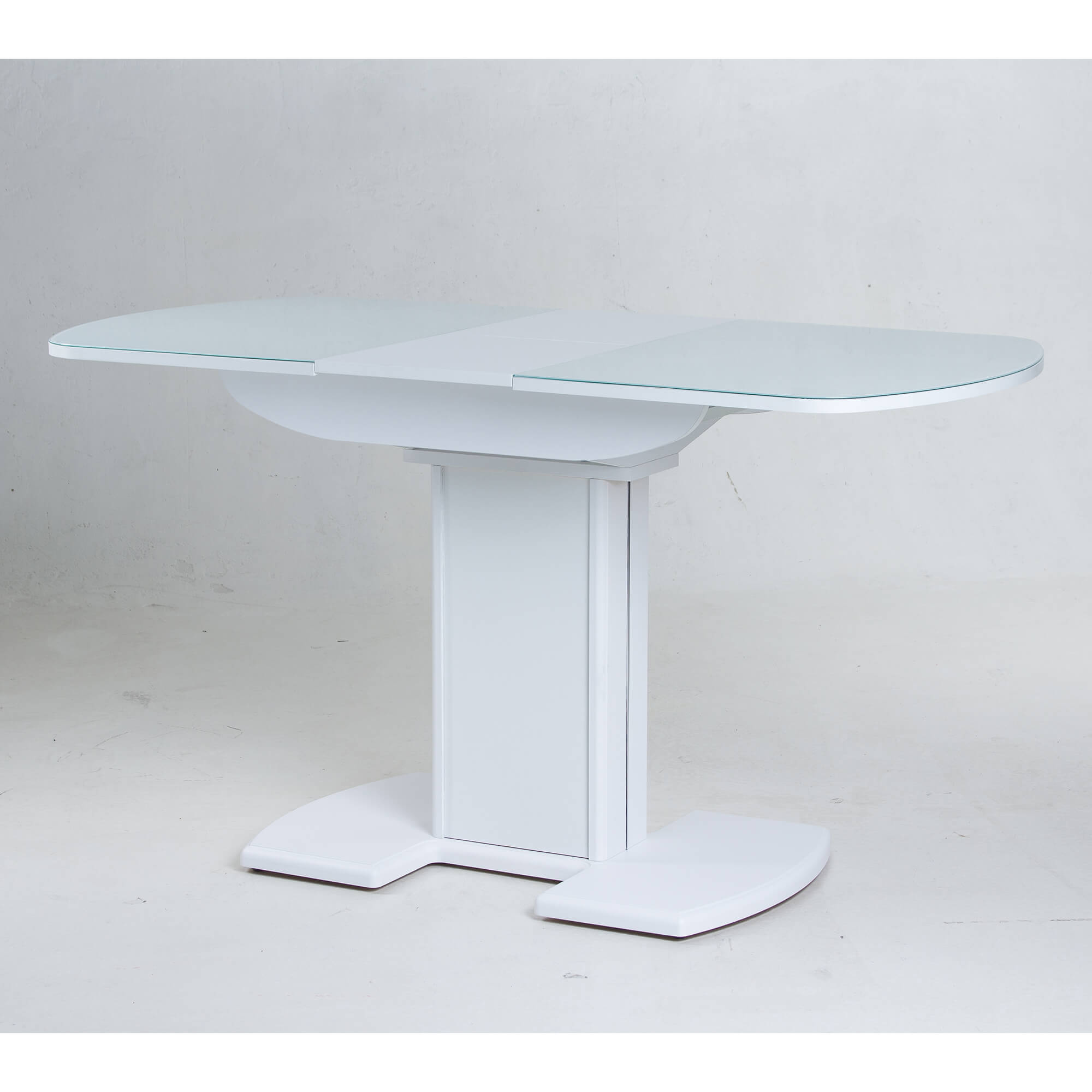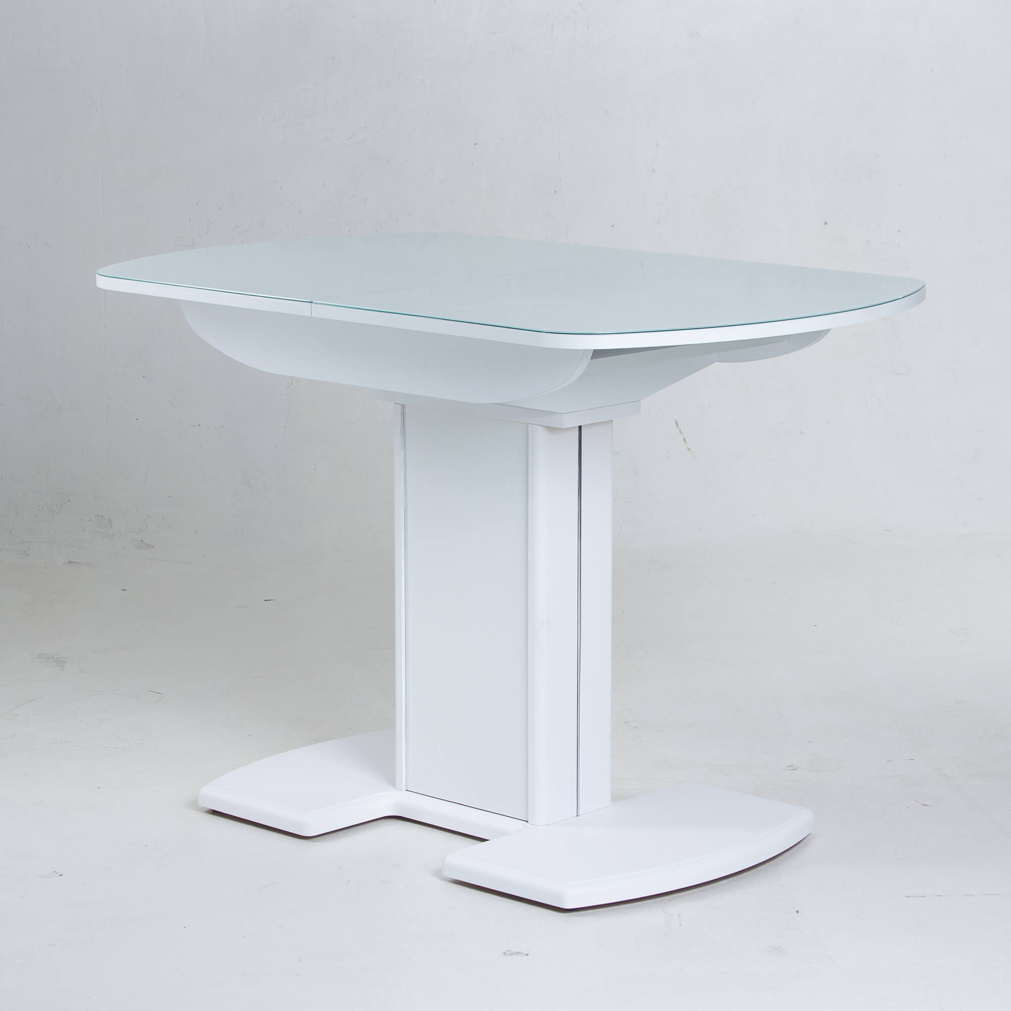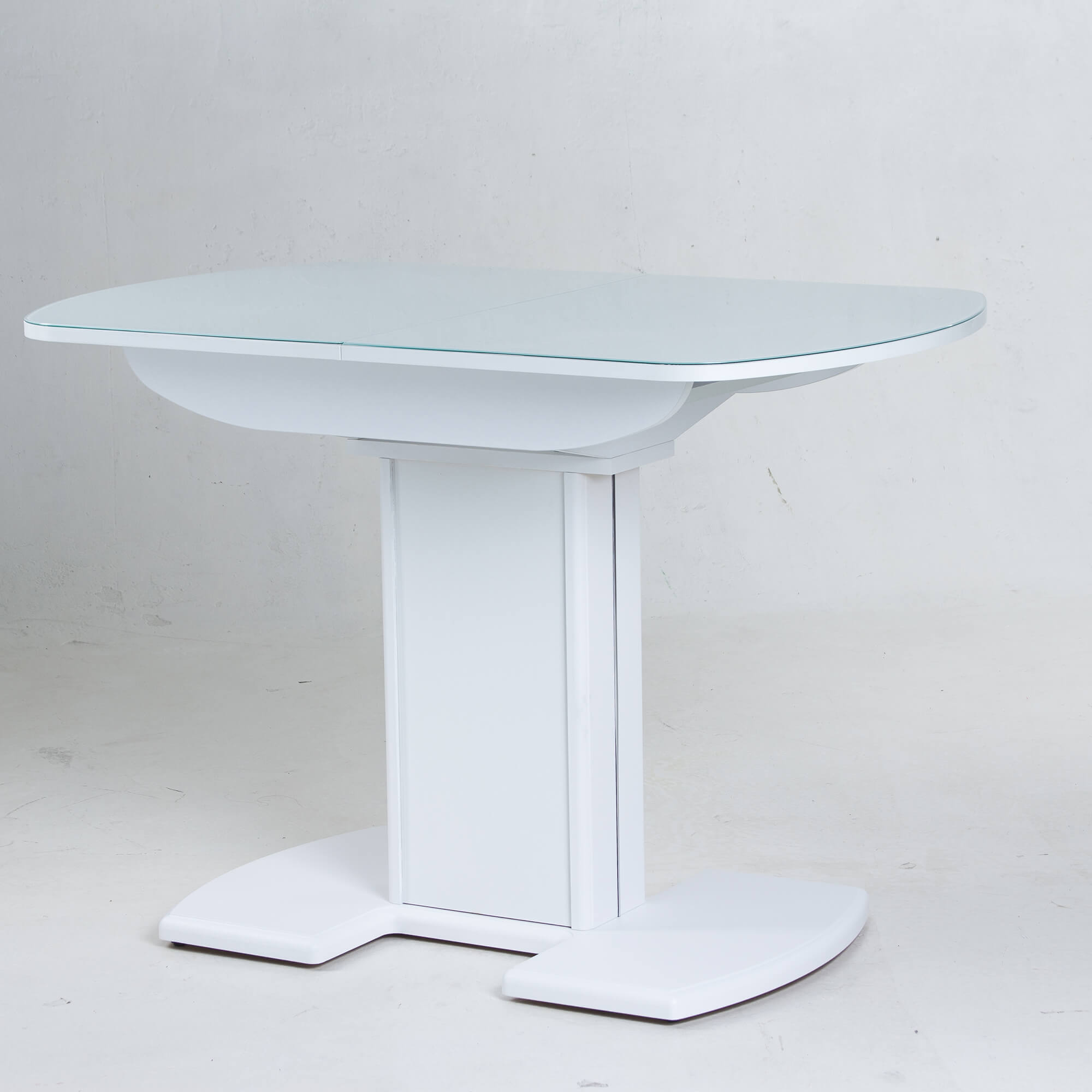 Раздвижной обеденный стол на одной опоре легко раскладывается, многофункционален, удобен. Выполнен из ЛДСП, столешница покрыта высококачественным закаленным стеклом 4 мм с безопасной фаской Safe face. Стекло окрашено немецкими керамическими красками Ferro.
