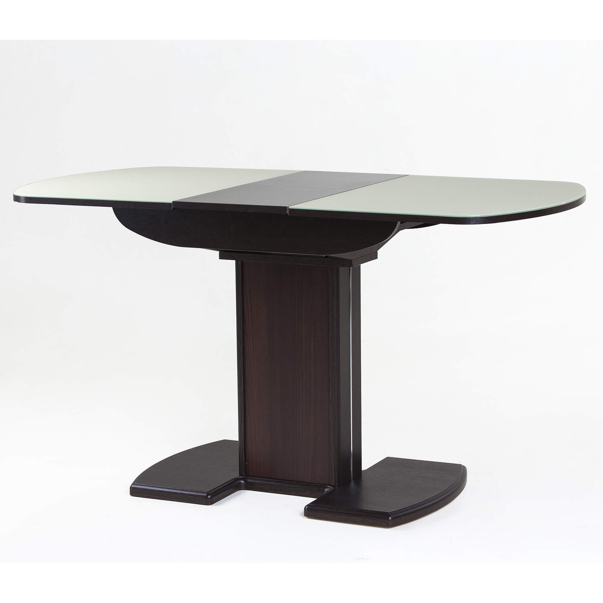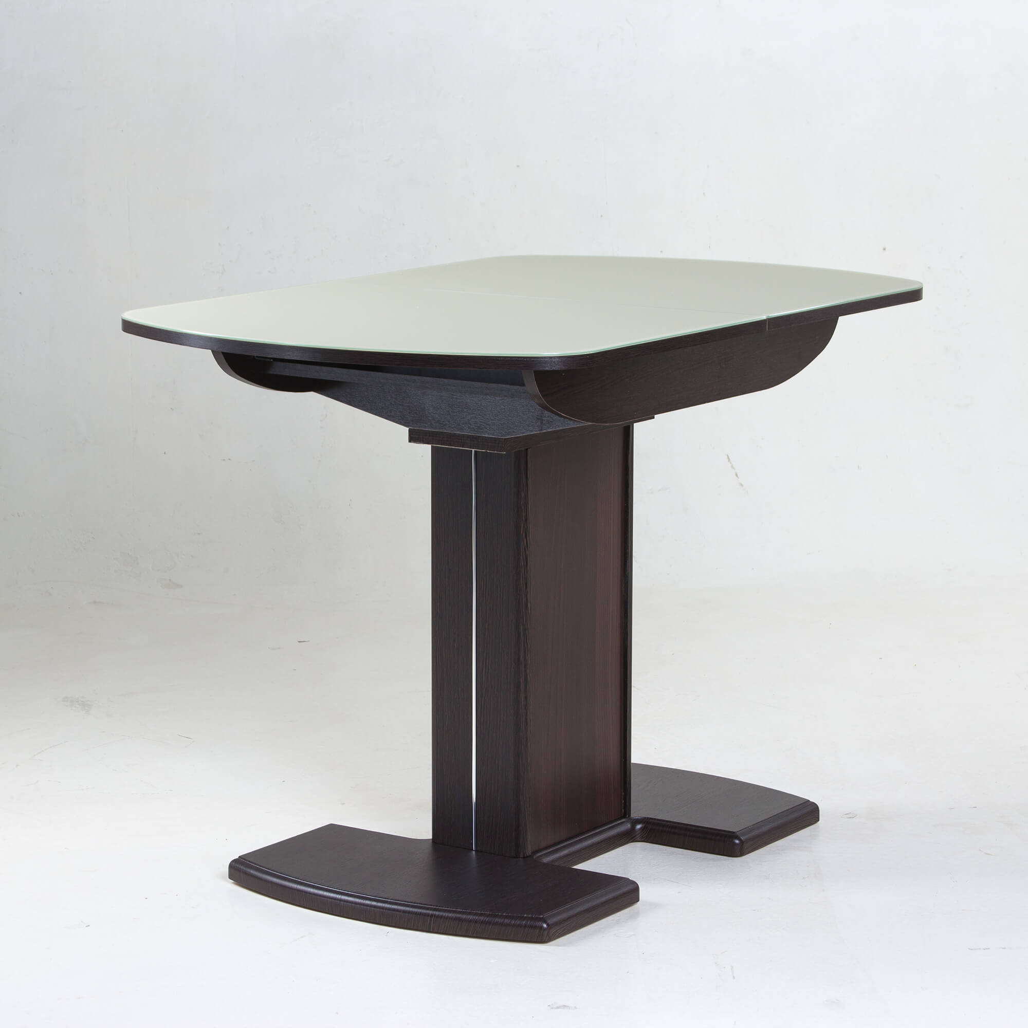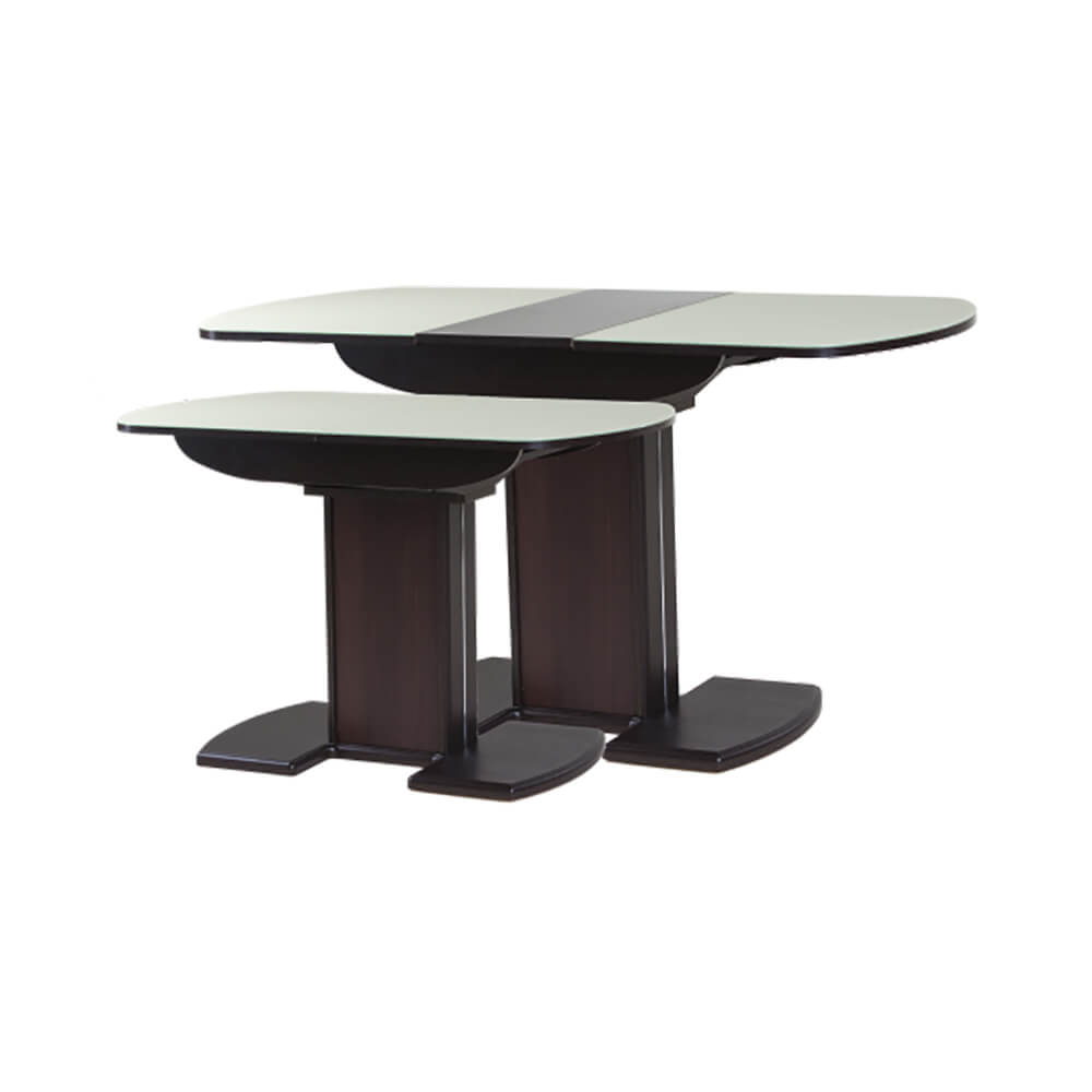 Раздвижной обеденный стол на одной опоре легко раскладывается, многофункционален, удобен. Выполнен из ЛДСП, столешница покрыта высококачественным закаленным стеклом 4 мм с безопасной фаской Safe face. Стекло окрашено немецкими керамическими красками Ferro.