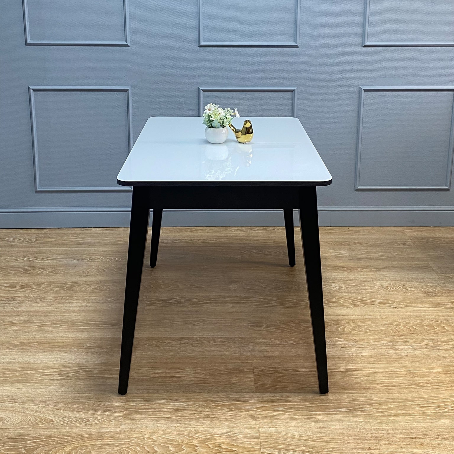 Самая функциональная форма стола из возможных. Стол можно поставить вплотную к стене по любому краю, царговый пояс позволяет поставить 2 стула шириной до 47см, широкая вставка со стеклом в цвет столешницы поможет вам удобно разместить еще 2 гостей.