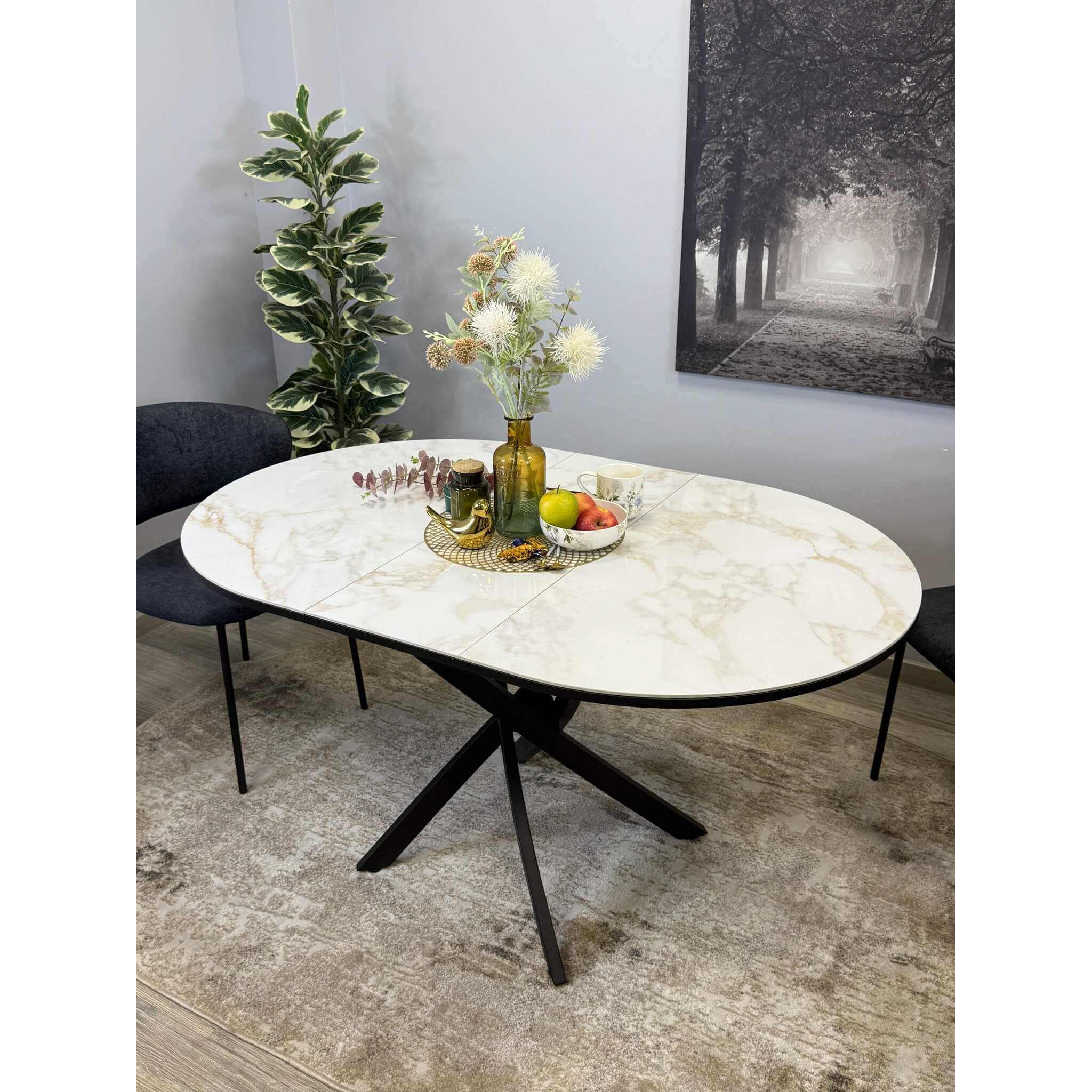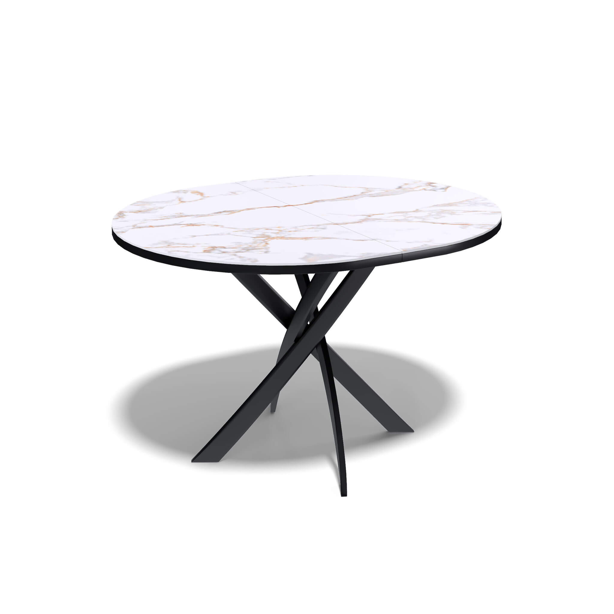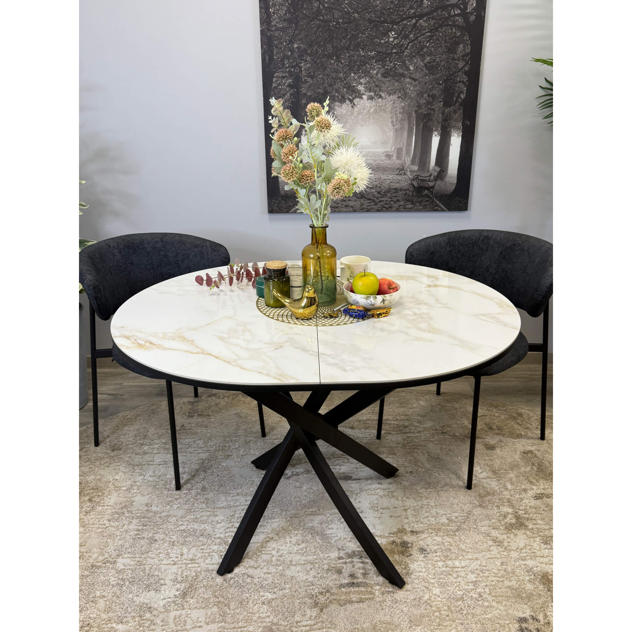 Ключевой особенностью этого стола является керамическая поверхность диаметром 100 см и долговечным, стабильным основанием. Дополняет комплект вставка на 30 см, расширяющая площадь стола.