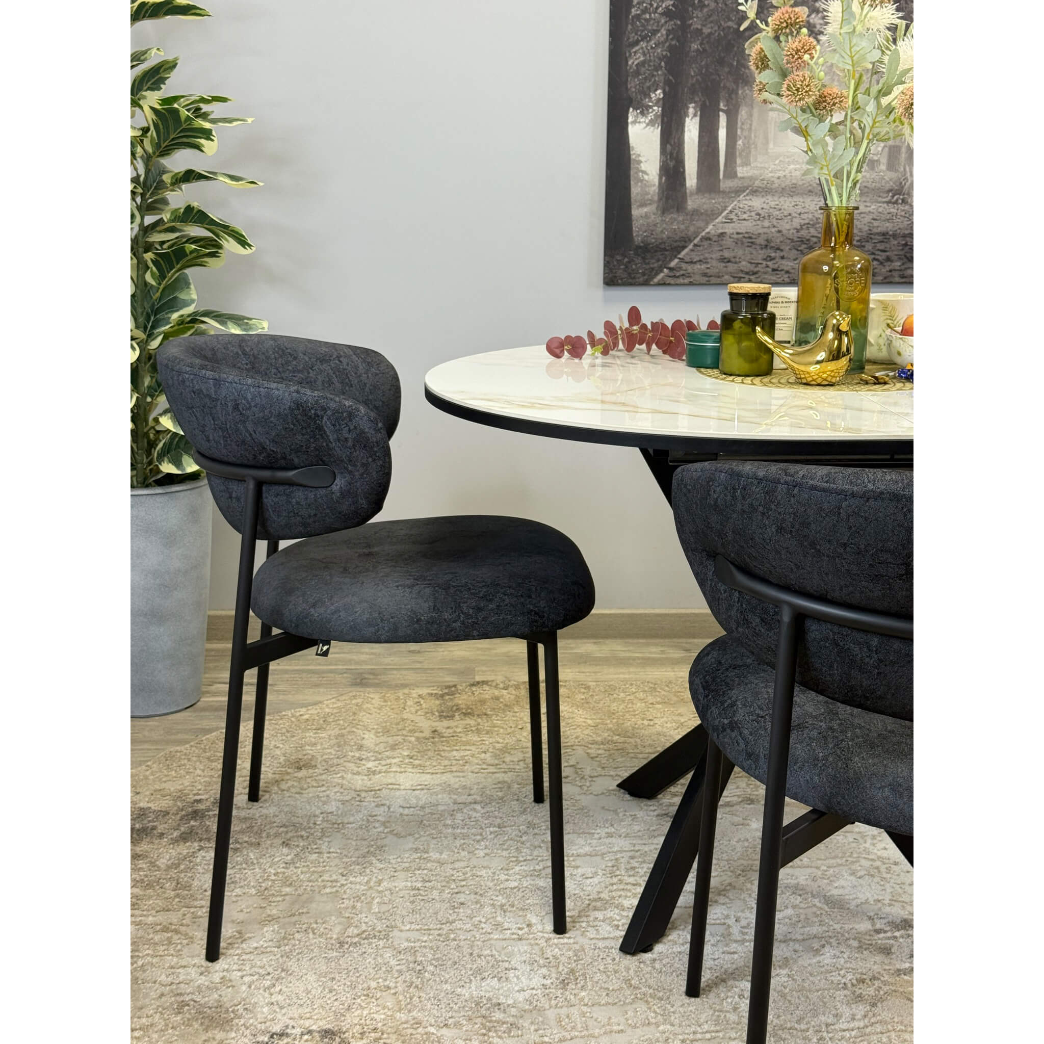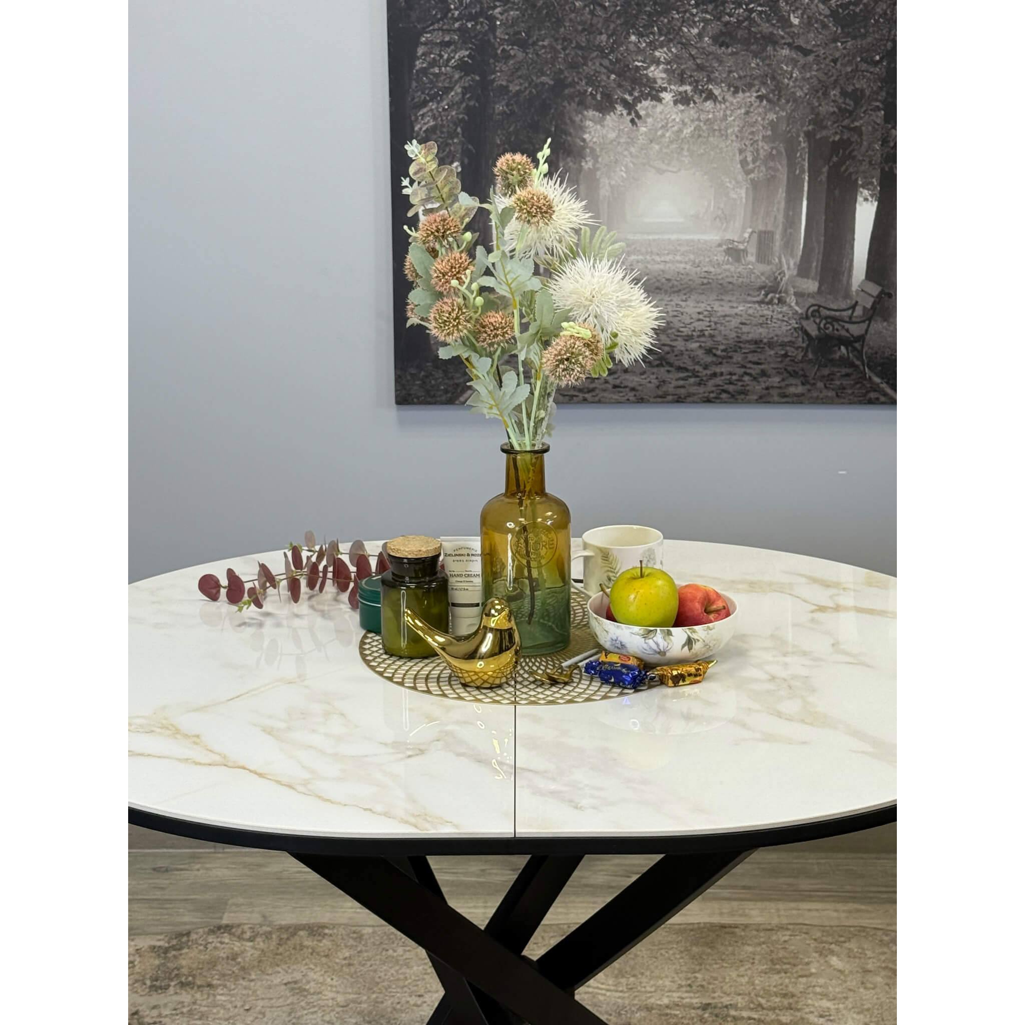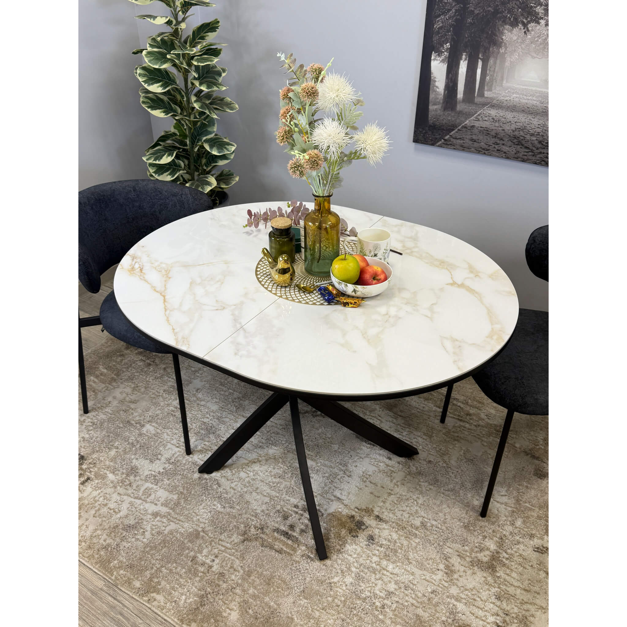 Ключевой особенностью этого стола является керамическая поверхность диаметром 100 см и долговечным, стабильным основанием. Дополняет комплект вставка на 30 см, расширяющая площадь стола.