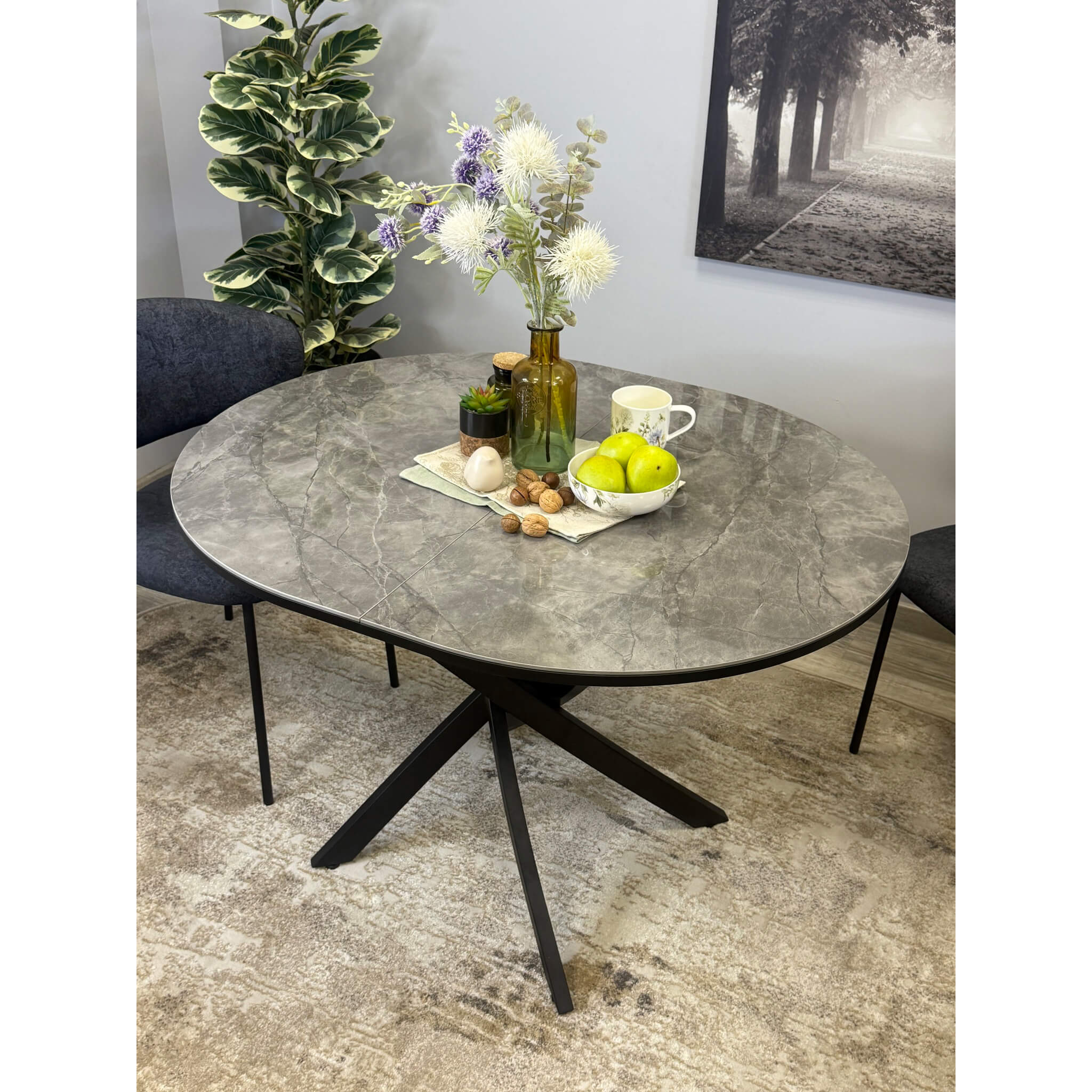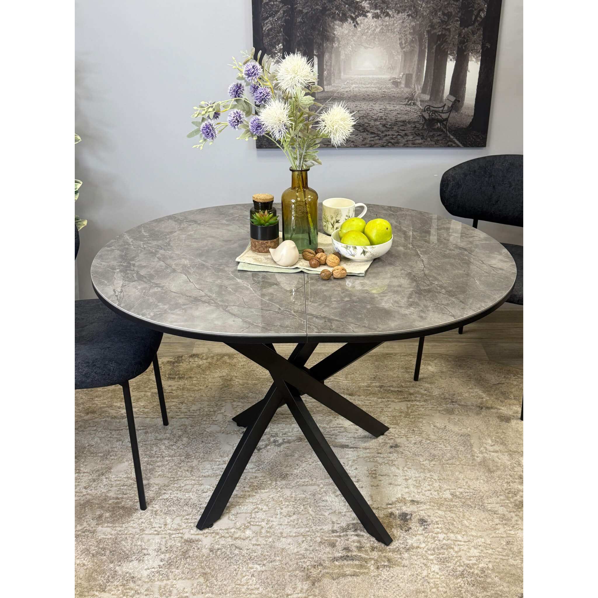 Ключевой особенностью этого стола является керамическая поверхность диаметром 100 см и долговечным, стабильным основанием. Дополняет комплект вставка на 30 см, расширяющая площадь стола.