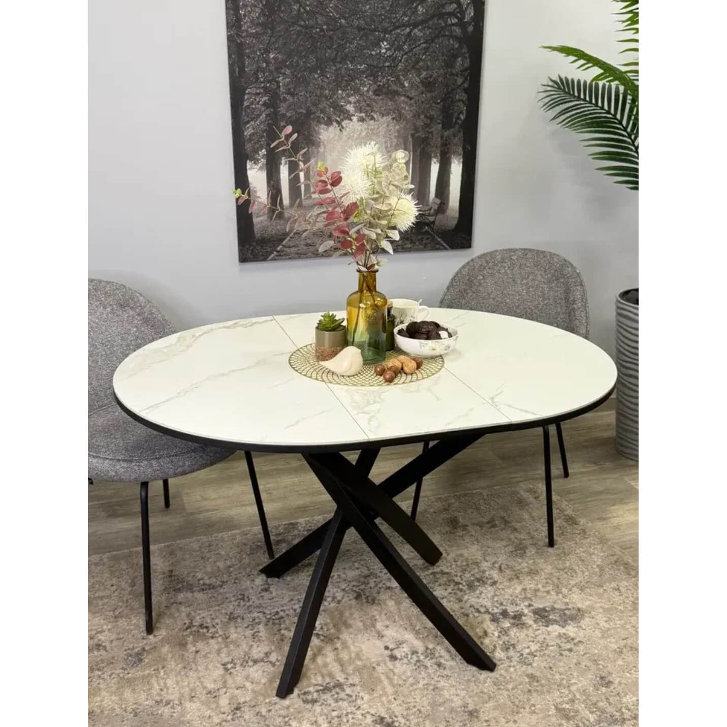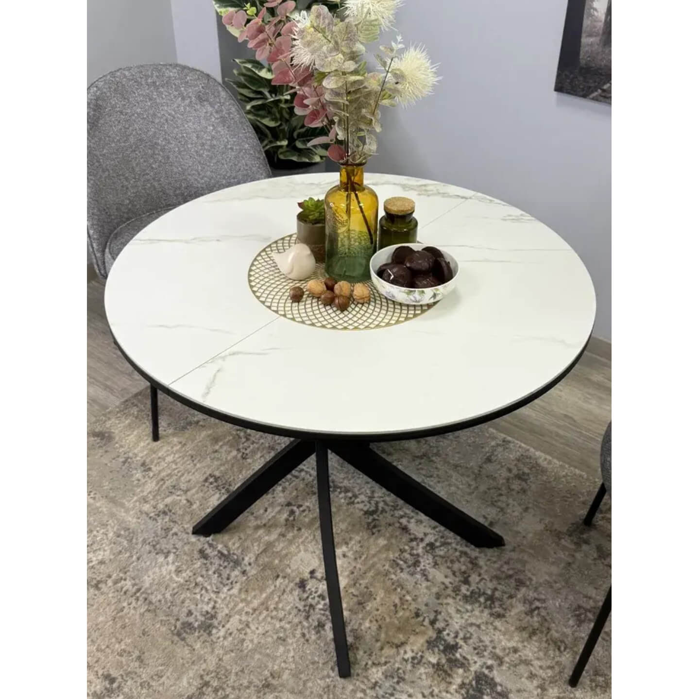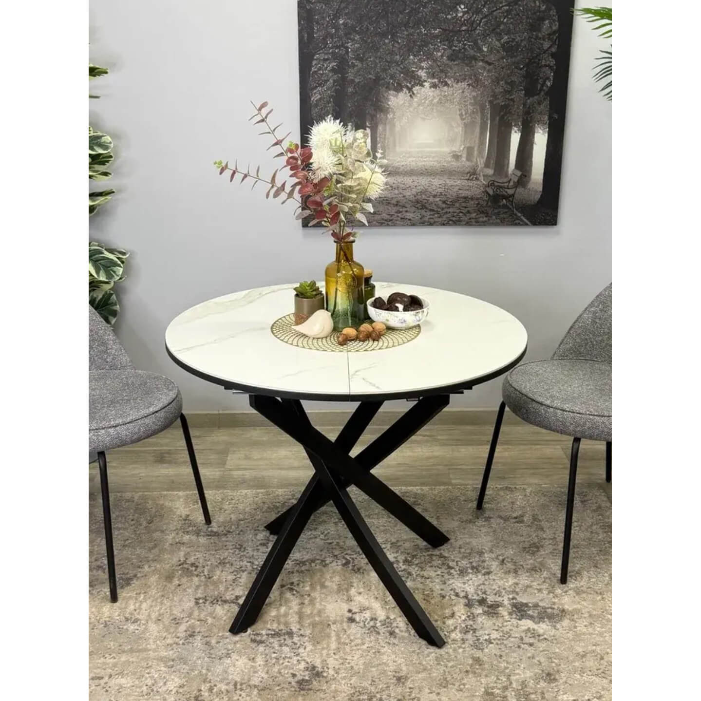 Ключевой особенностью этого стола является керамическая поверхность диаметром 90 см и долговечным, стабильным основанием. Дополняет комплект вставка на 30 см, расширяющая площадь стола.