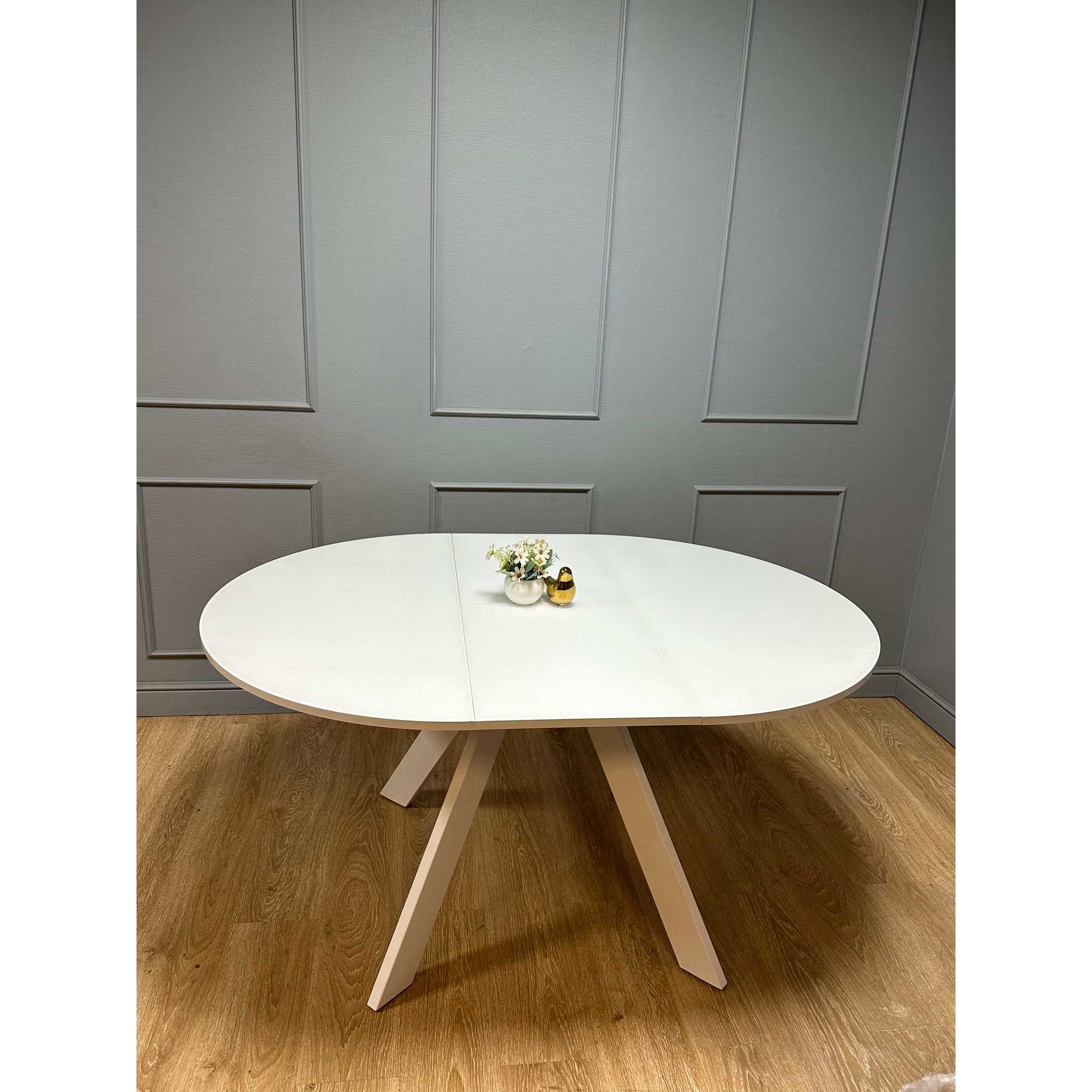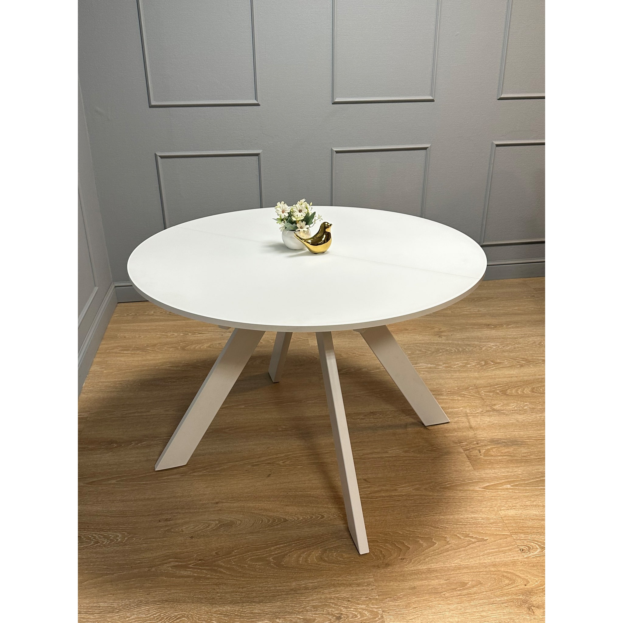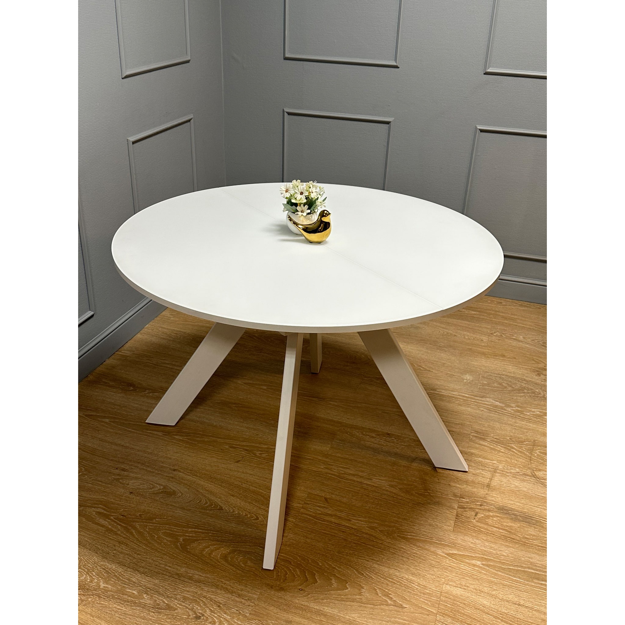 Круглый стол оптимального размера. Диаметр 1100мм позволяет и комфортное размещение 4 человек для постоянного использования и организацию места для гостей и при этом стол не занимает много места.