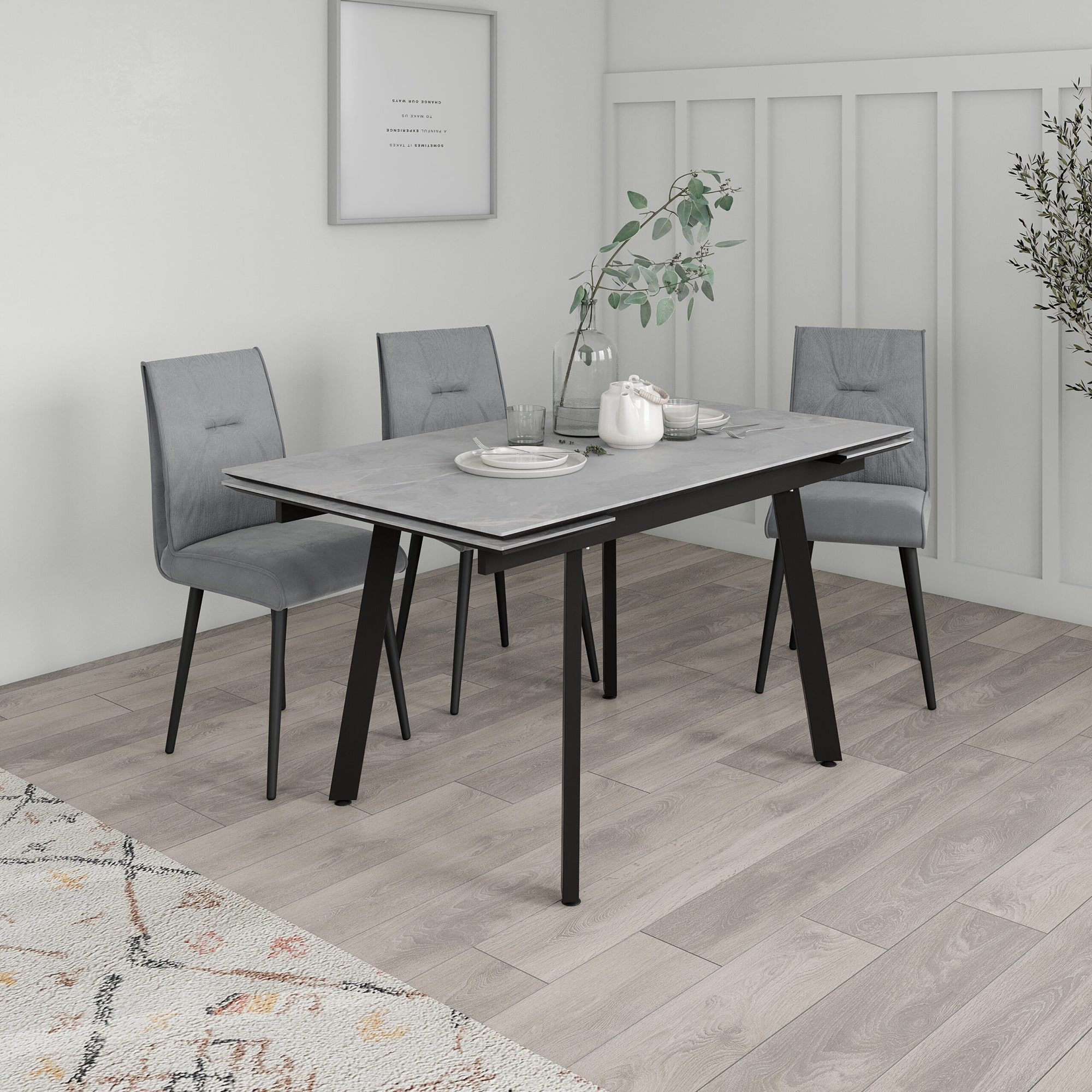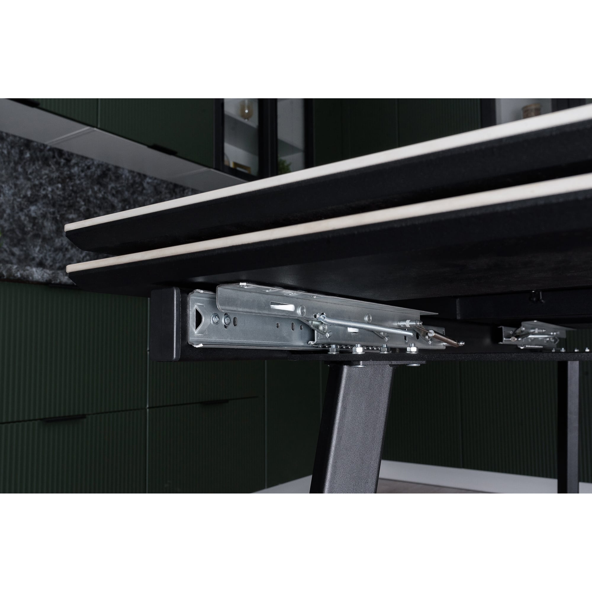 Стол со столешницей из керамогранита на металлических ножках с регулируемыми шарнирными опорами. В раздвижном варианте трансформацию стола обеспечивает механизм торцевого раздвижения. Разборное стальное подстолье.