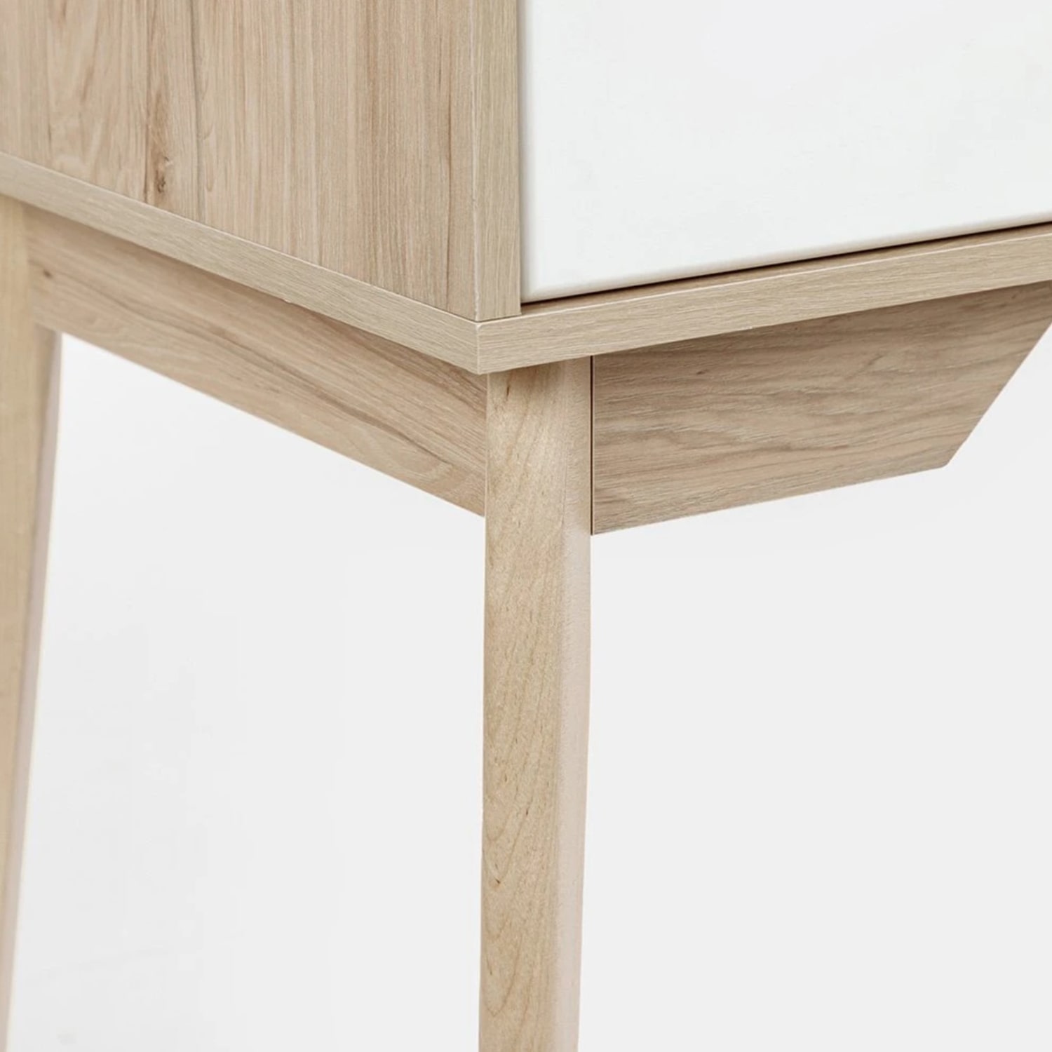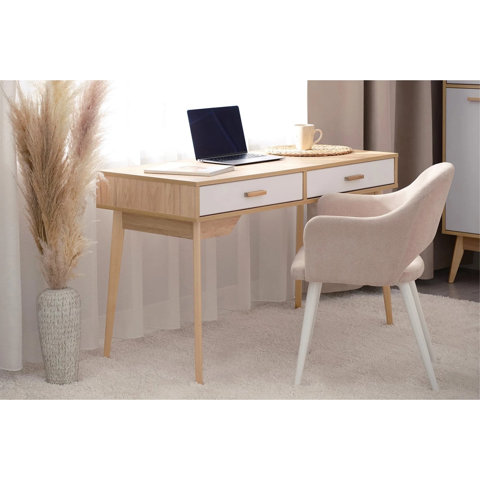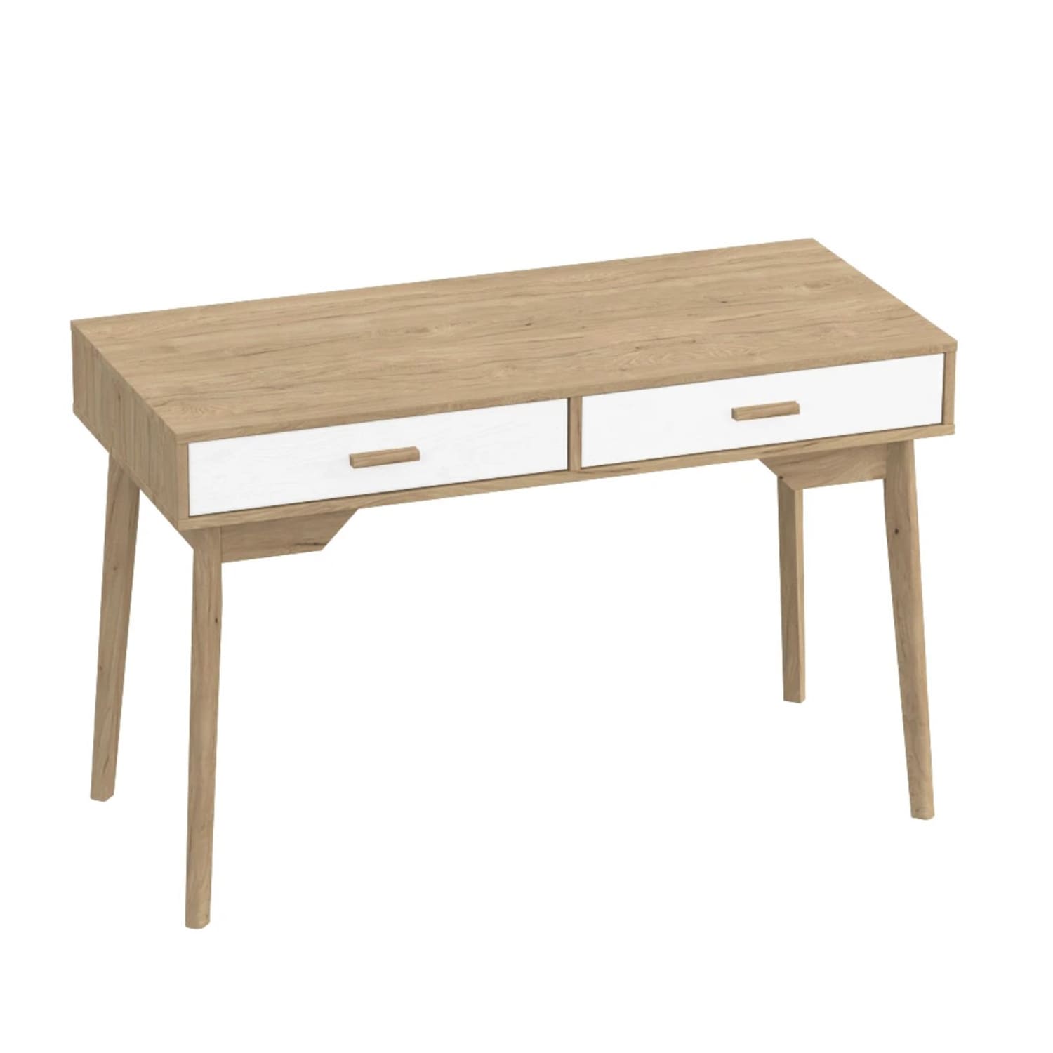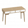 Столешница и корпус стола выполнены из ЛДСП под цвет натурального дуба, фасады ящиков - из МДФ, а ручки — из массива березы.