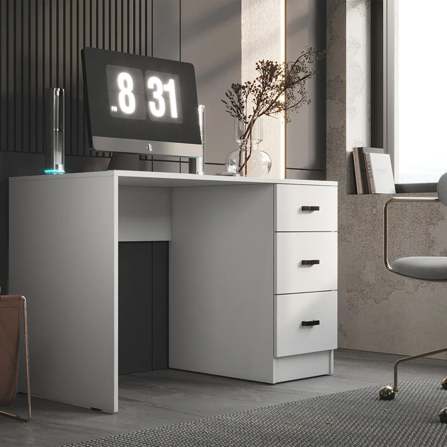 Стол оборудован тремя выдвижными ящиками, что позволяет удобно хранить все необходимые предметы. Ящики оснащены роликовыми направляющими, обеспечивающими плавное и бесшумное движение.