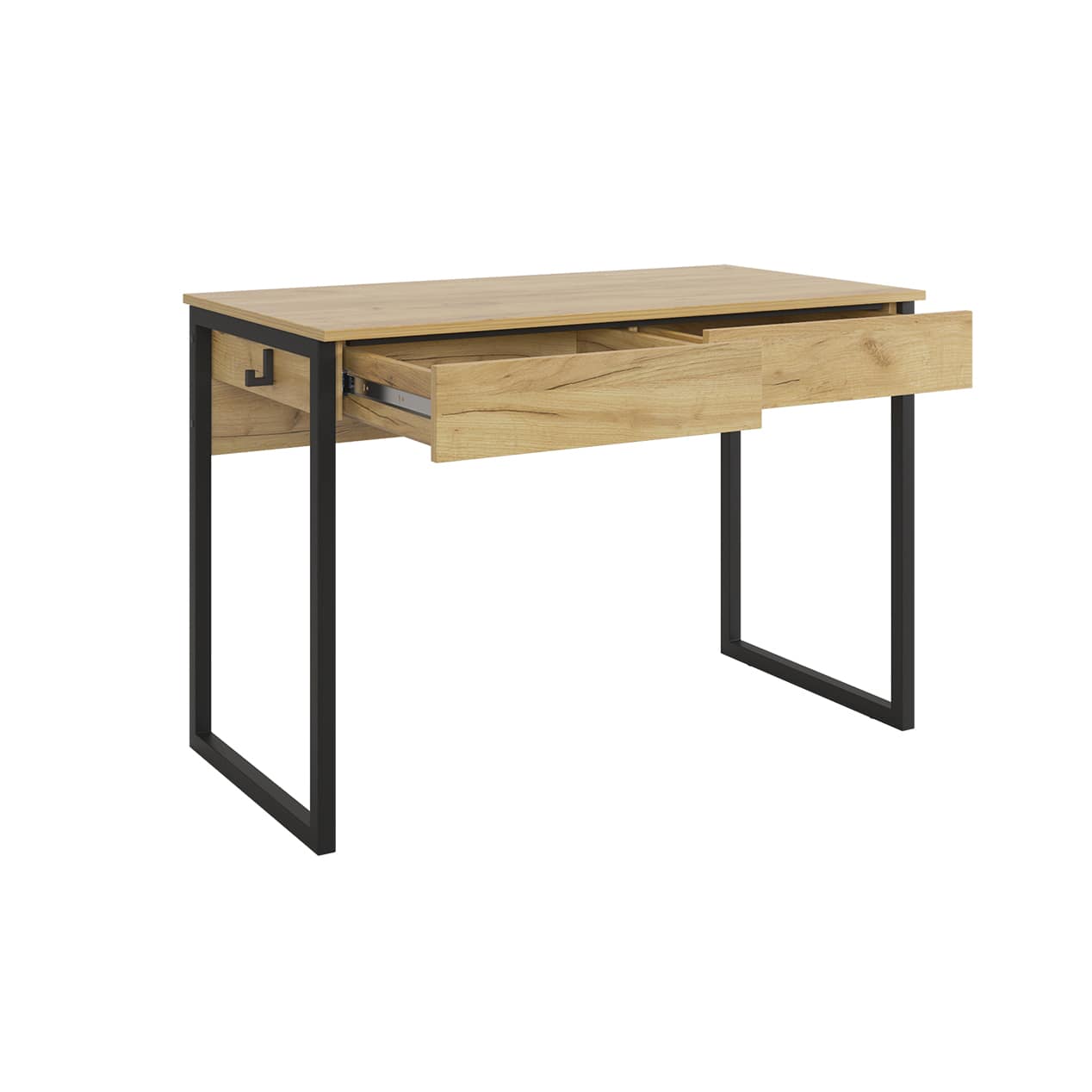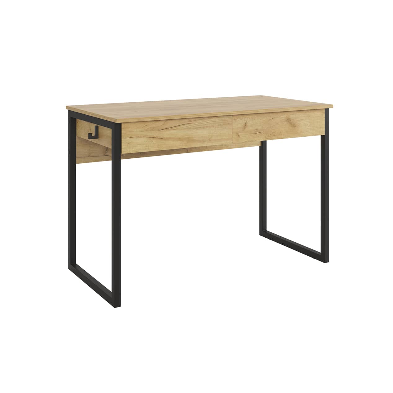 Стол на металлических опорах с двумя выкатными ящиками на шариковых направляющих, усиленный и надежный каркас, благодаря металлическому ребру жесткости под столешницей,будет стильным акцентов в комнате. Крючок на боковой стенке стола будет полезным дополнением для рюкзака или наушников.