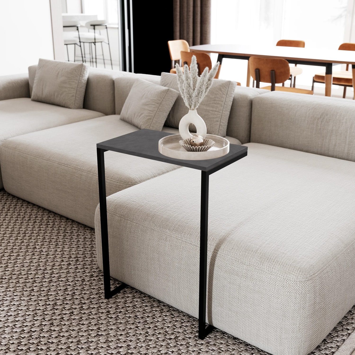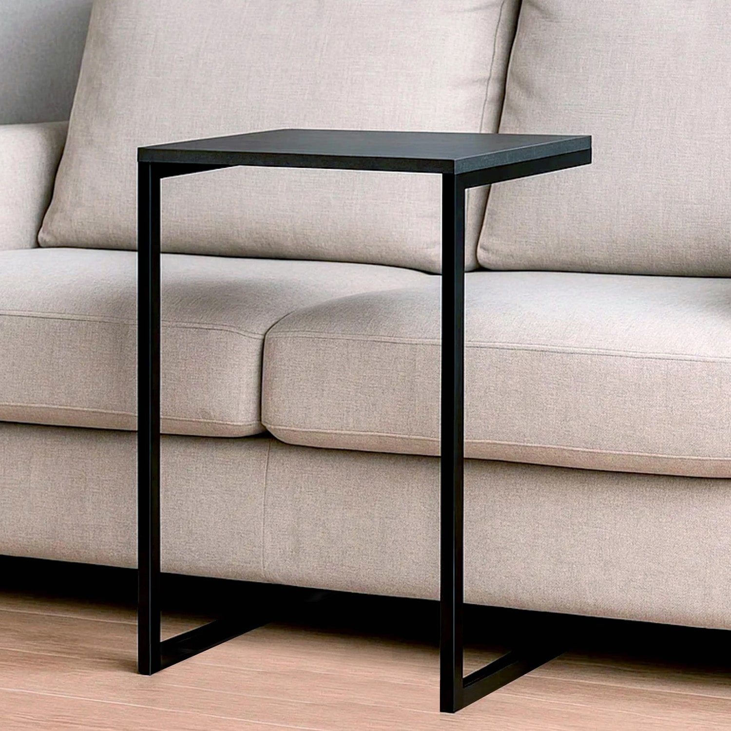 Стол с прямоугольной столешницей из ЛДСП, опорой для которой служит металлокаркас.