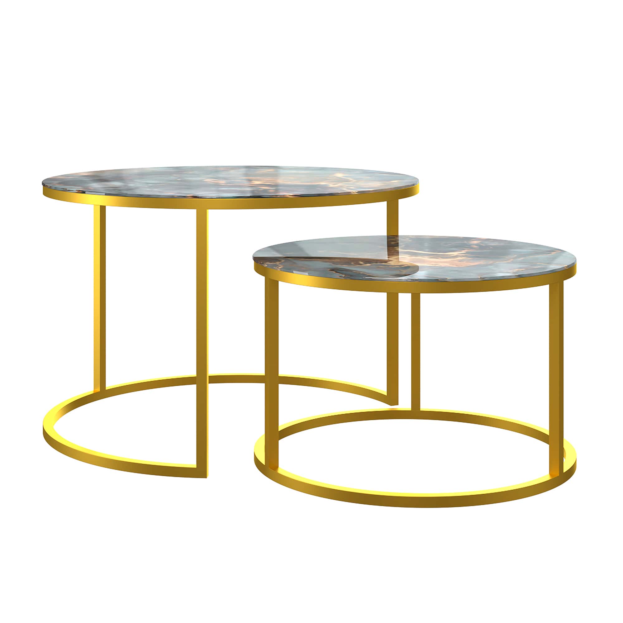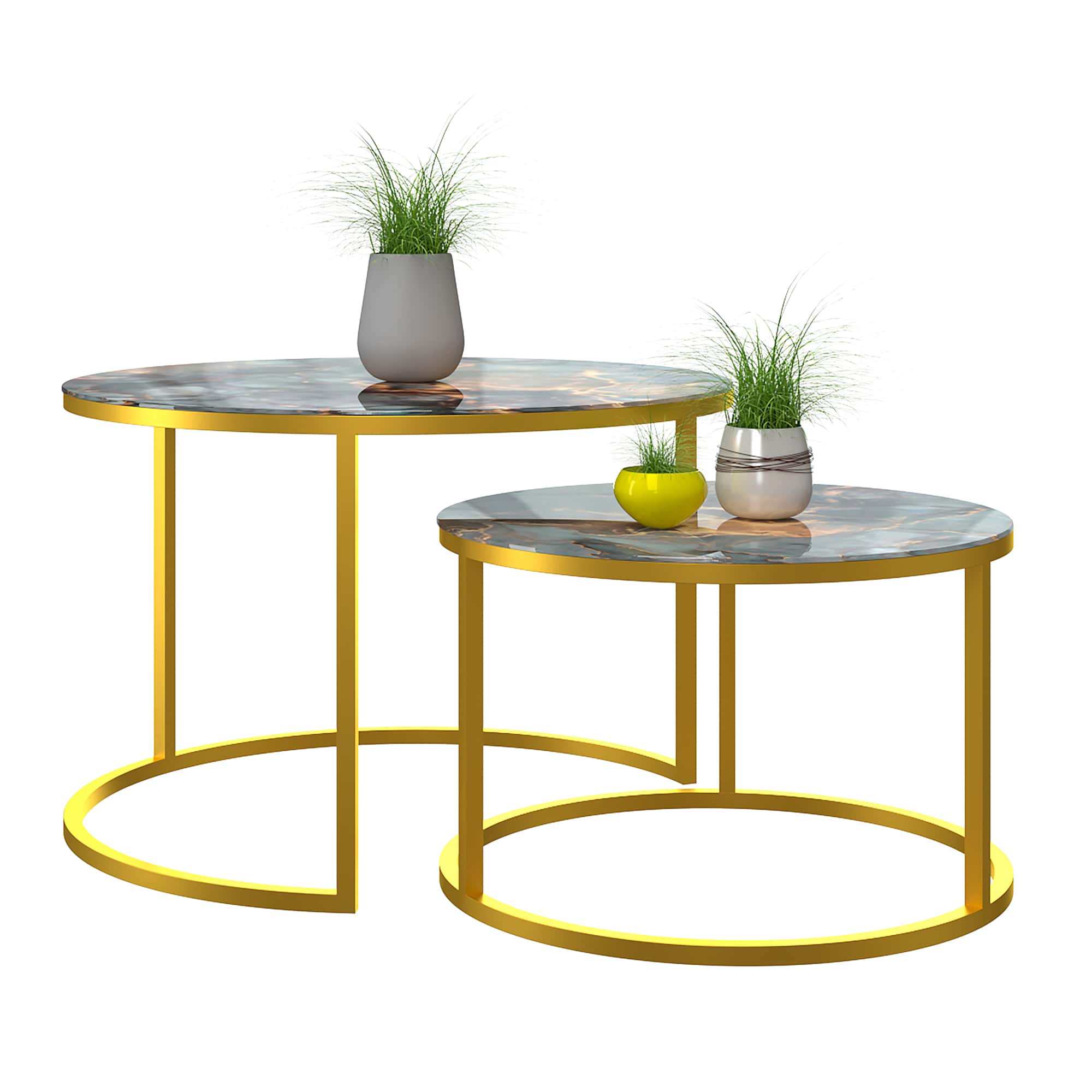 Диаметр большого 605, малого 475. Высота большого - 420 мм, высота малого - 320 мм. Металлический каркас - порошковое покрытие золотой муар, стекло с фотопечатью серо-зеленый мрамор.