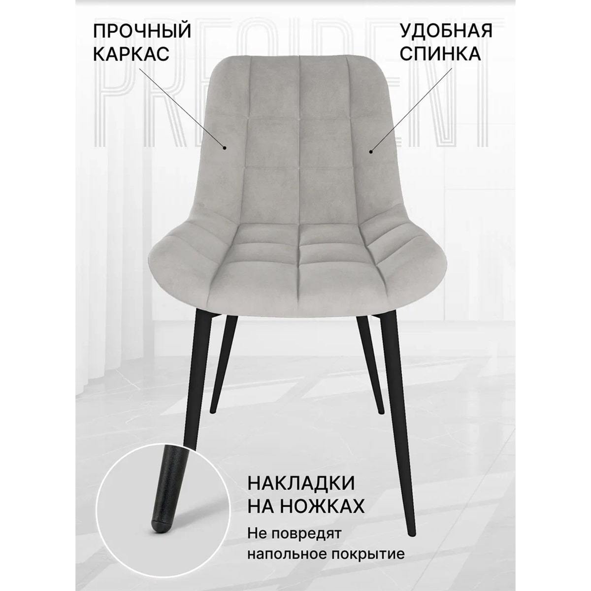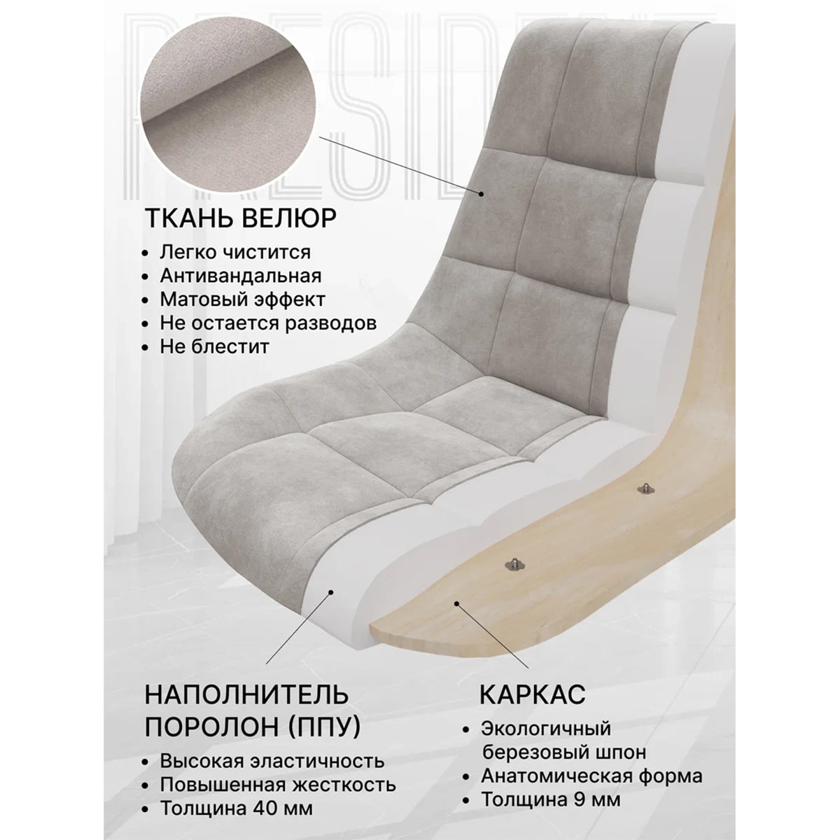 Высококачественный велюр. Обивка из высококачественного велюра придает стулу «Президент» не только изысканный вид, но и обеспечивает непревзойденный комфорт. Мягкий на ощупь материал создает удивительные ощущения и приносит настоящее удовольствие от использования.