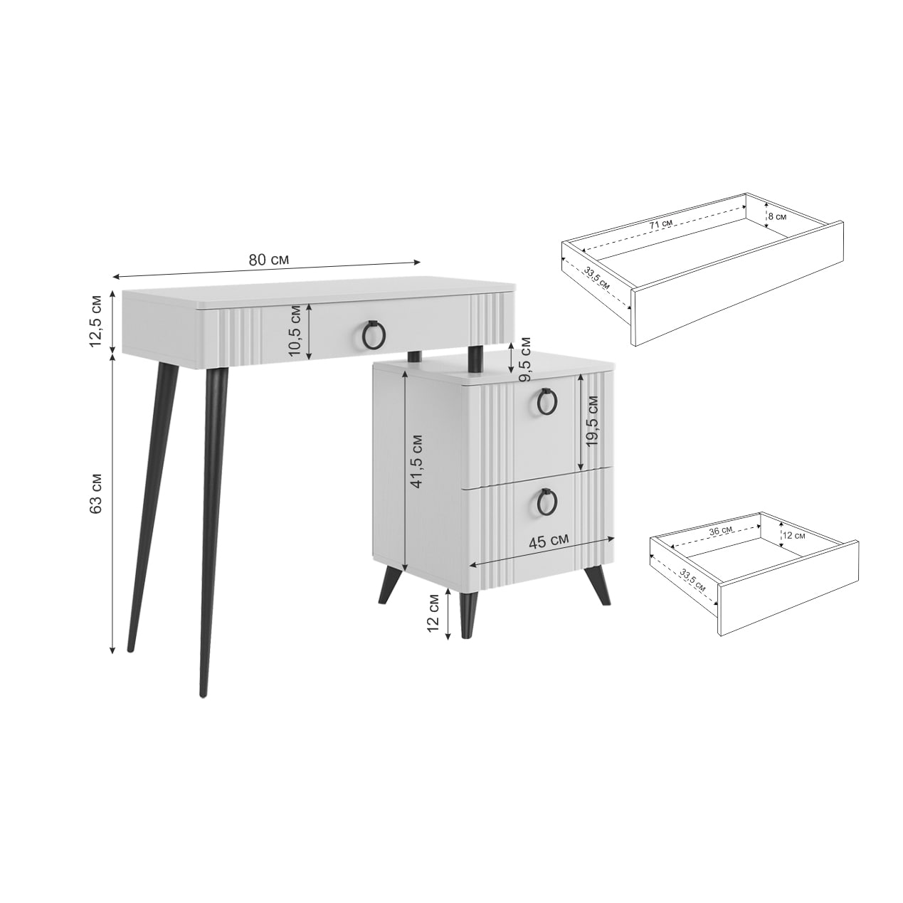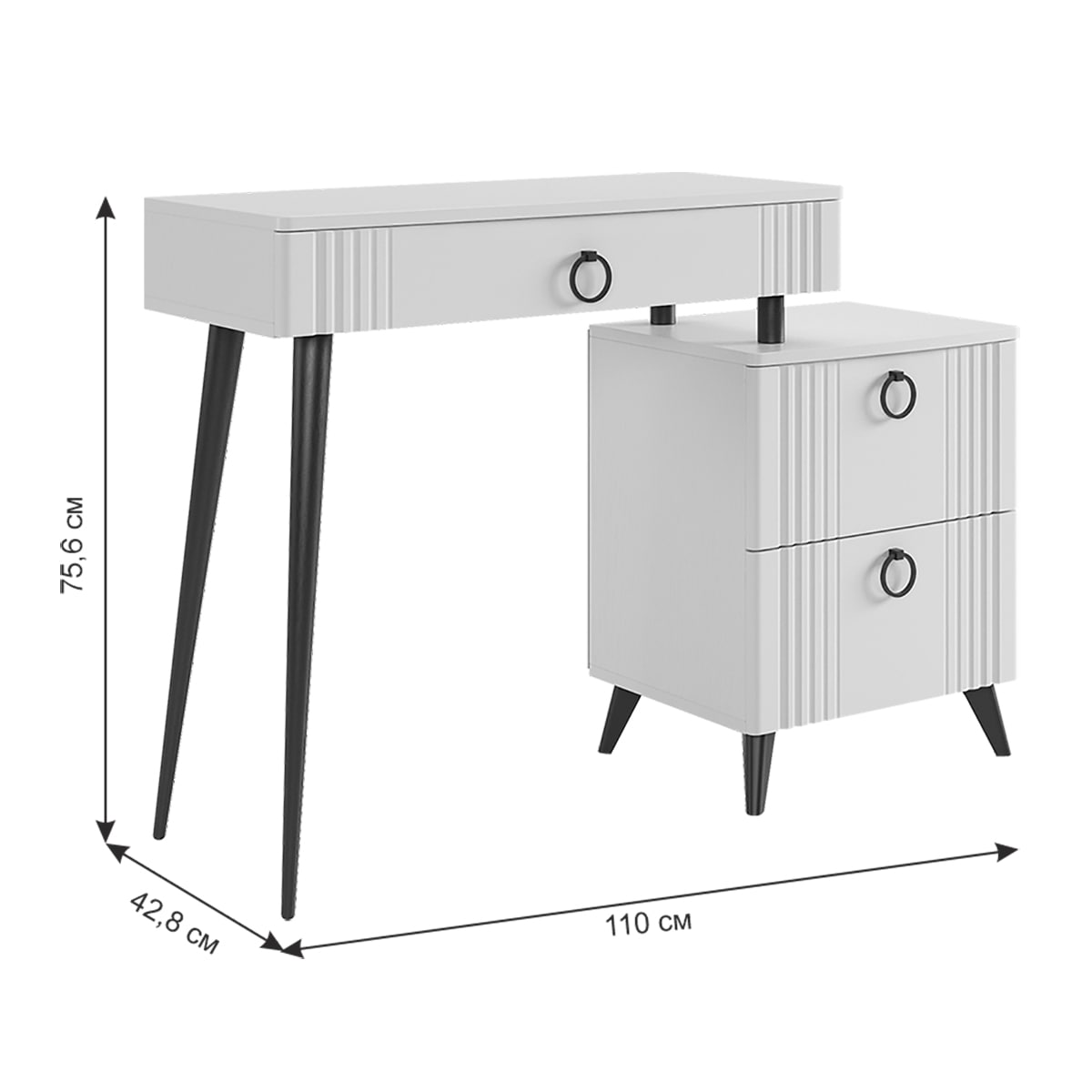 Туалетный столик "Ева" прекрасно впишется в интерьер спальни или ванной комнаты благодаря своему стильному дизайну и функциональности. Вместительные выкатные ящики обеспечат удобное хранение косметики, украшений и других мелочей. Шариковые направляющие гарантируют легкость открывания и закрывания ящиков, а металлические ручки добавляют стильный акцент. Высокие черные опоры придают столику устойчивость и элегантность.