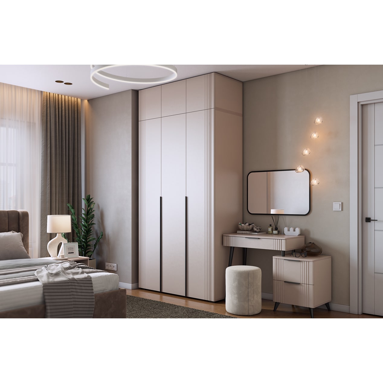 Благодаря своему дизайну трюмо «Катрин М» легко впишется в любой интерьер и гармонично сочетается с другими модулями спальни «Катрин М». Выкатные ящики предоставляют достаточно места для хранения различных предметов, а возможность использования трюмо в качестве письменного стола делает его универсальным элементом мебели.