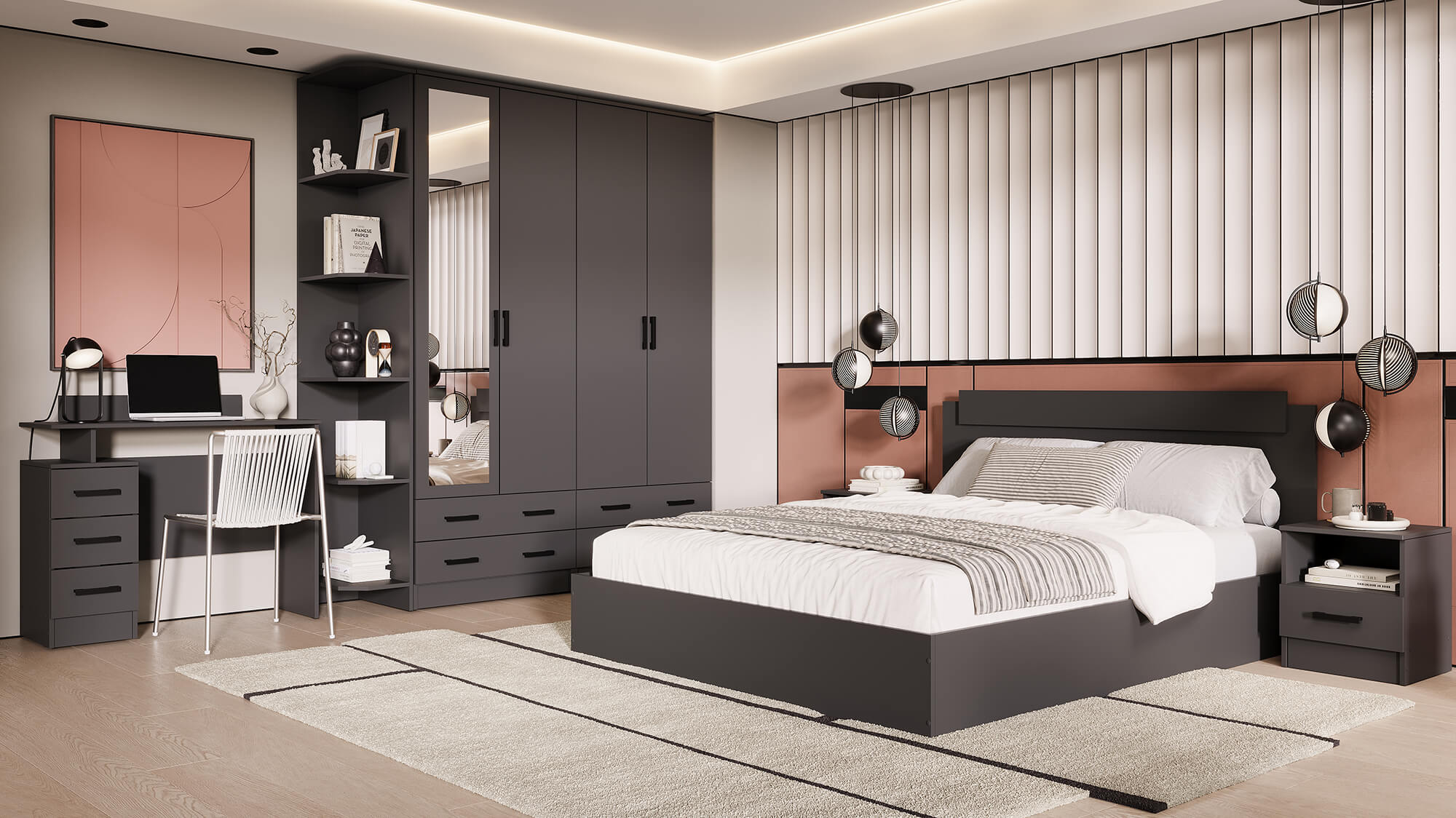 Столик выполнен в современном стиле, что делает его актуальным и современным решением для вашей спальни. Цвет Графит придает изделию элегантность и утонченность.