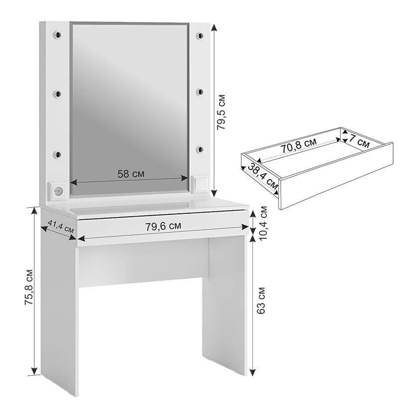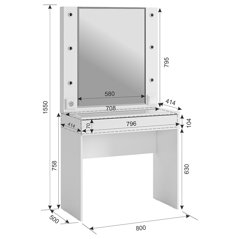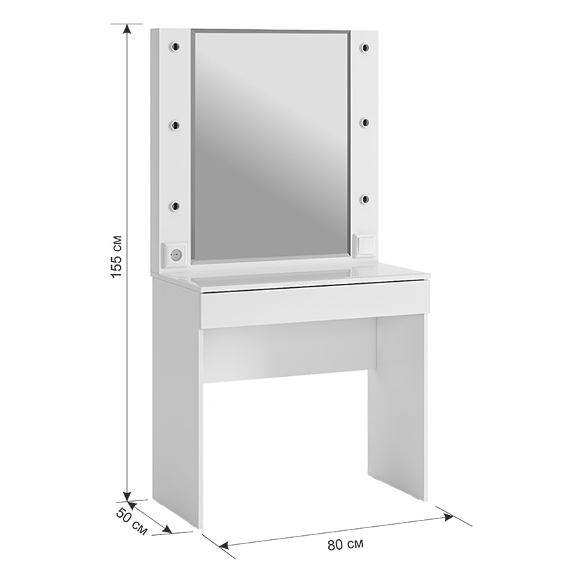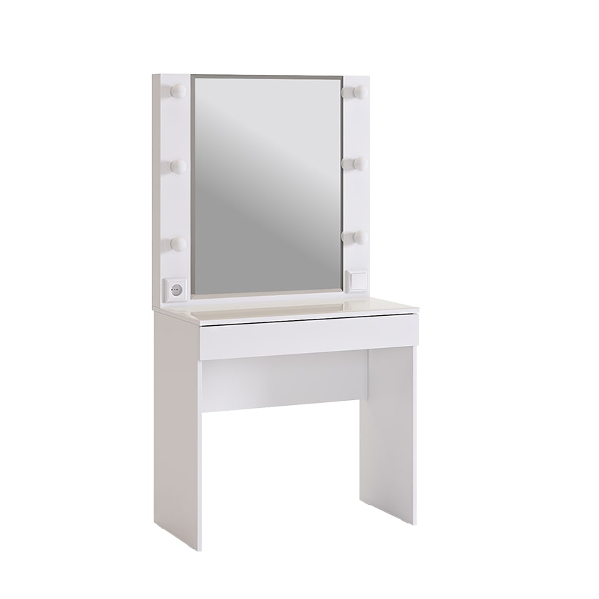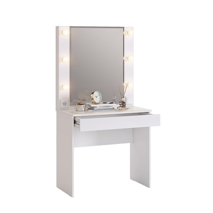 Туалетный столик Гламур спроектирован, чтобы удовлетворить потребности современной юной леди. С широким зеркалом, яркой подсветкой и просторным ящиком для аксессуаров, это трюмо идеально подходит для каждодневного использования. Дополнительный функционал в виде розетки позволяет без проблем подключить фен или другую косметическую технику. А удобные патроны для ламп, выключатель и длинный провод делают его еще более практичным. Стоит отметить, что лампы в комплектацию не включены.