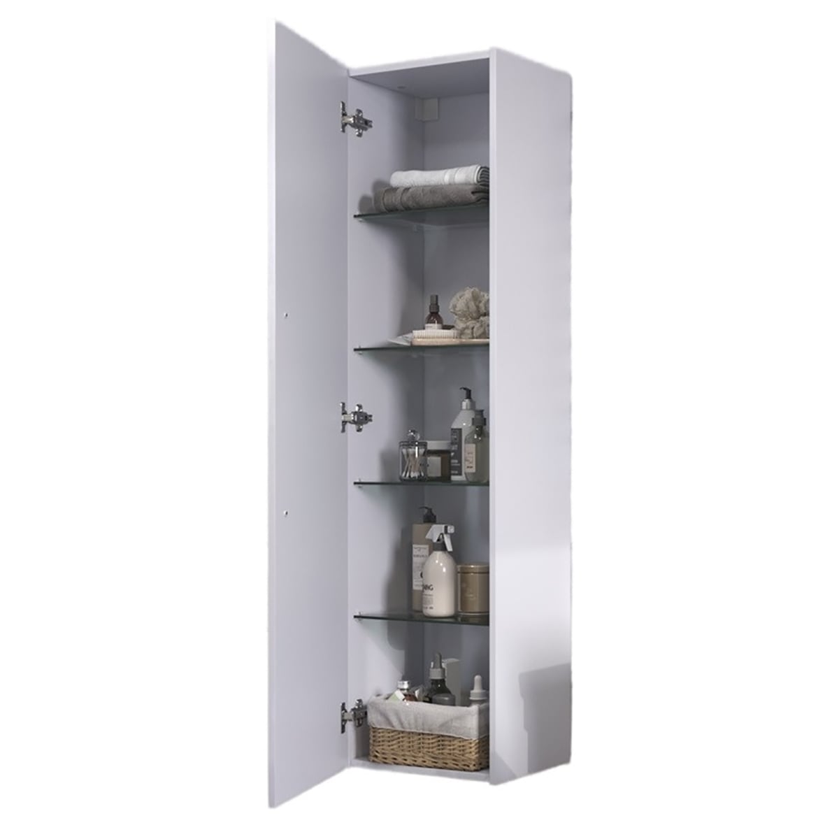 Оснащение: 1 дверца, 4 стеклянные полки, ручка металлическая хромированная.