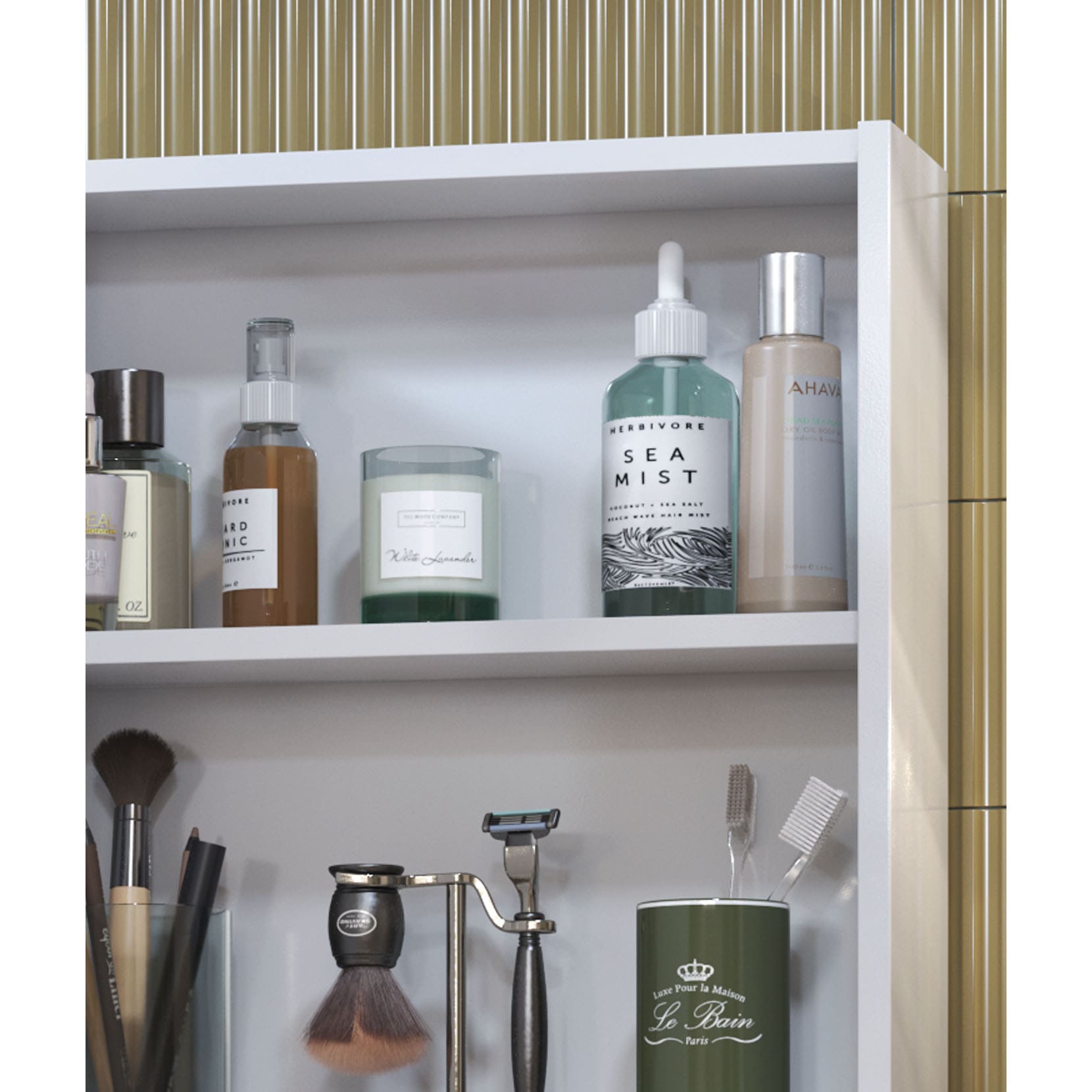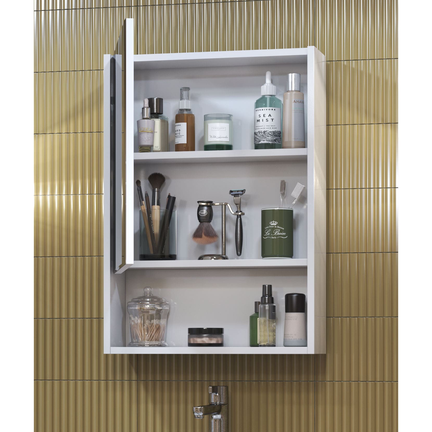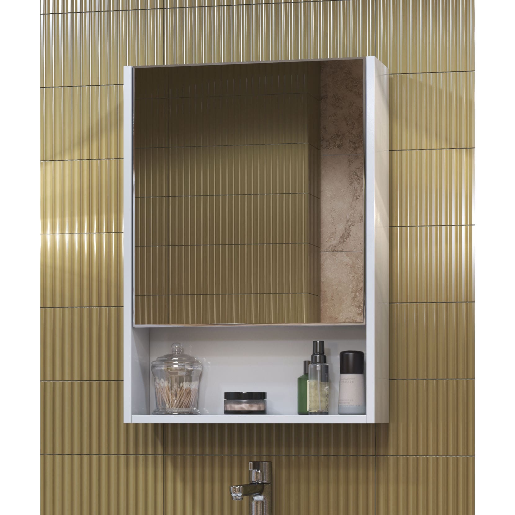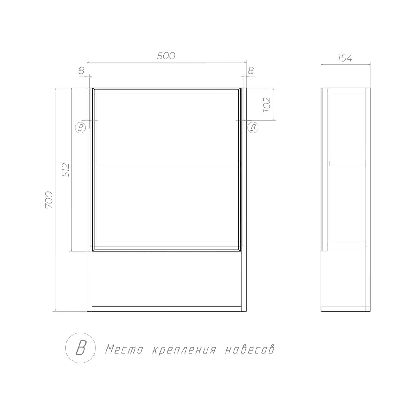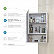 Оснащение: 1 дверца, петли с механизмом доводчика, зеркало с фацетом, 2 полки ЛДСП, 1 открытая полка снизу.
