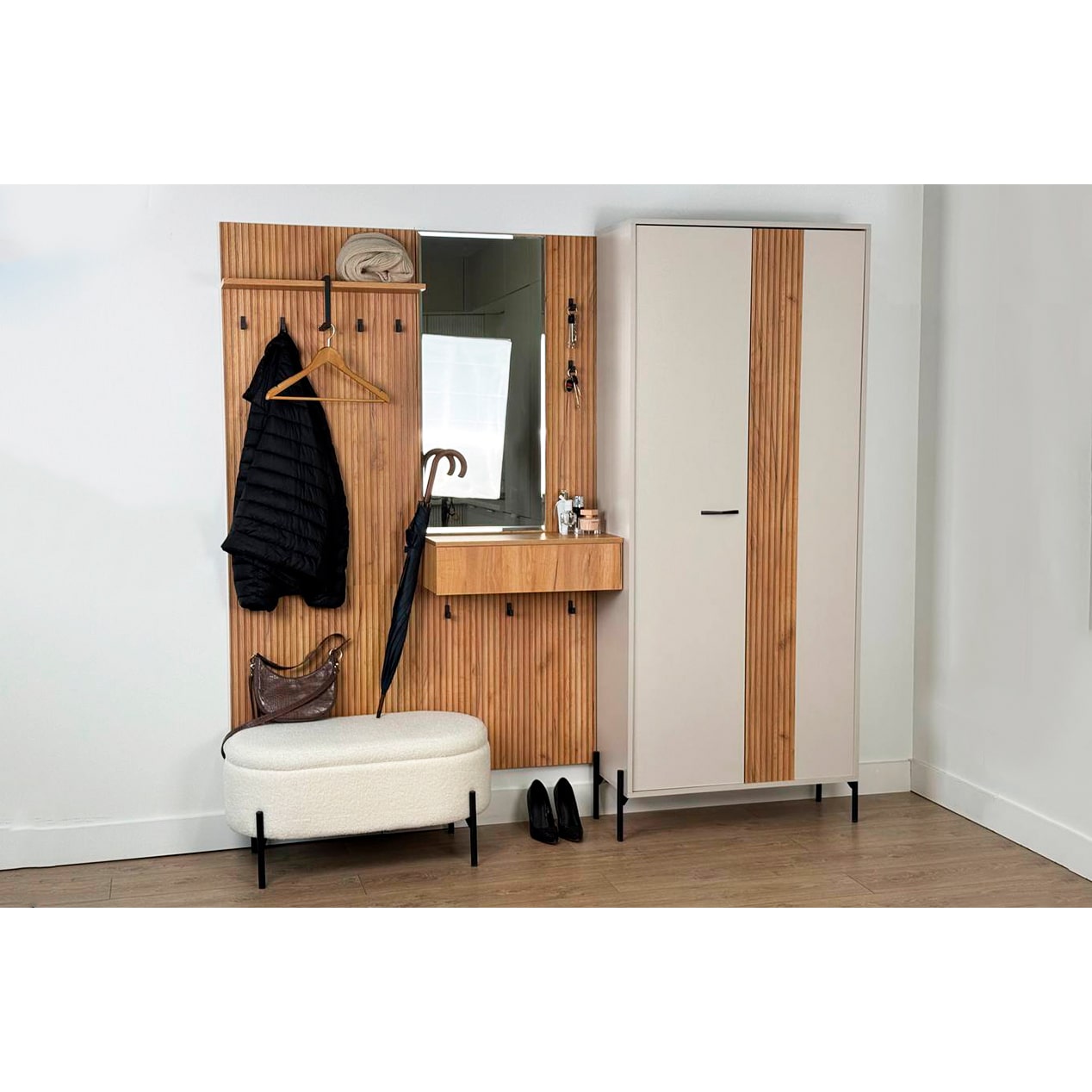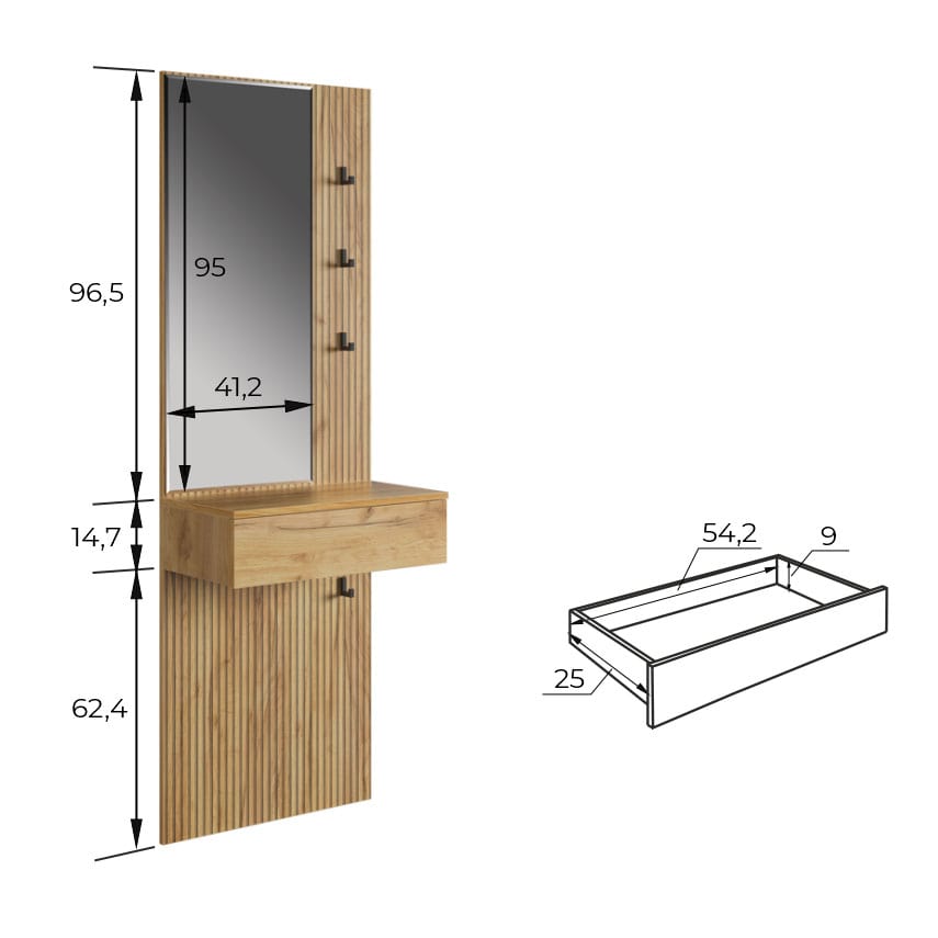 Крючки предоставляют удобное место для хранения сумок или аксессуаров. Выкатной ящик служит дополнительным пространством для хранения мелочей, таких как ключи, кошелек, косметика или другие небольшие предметы.