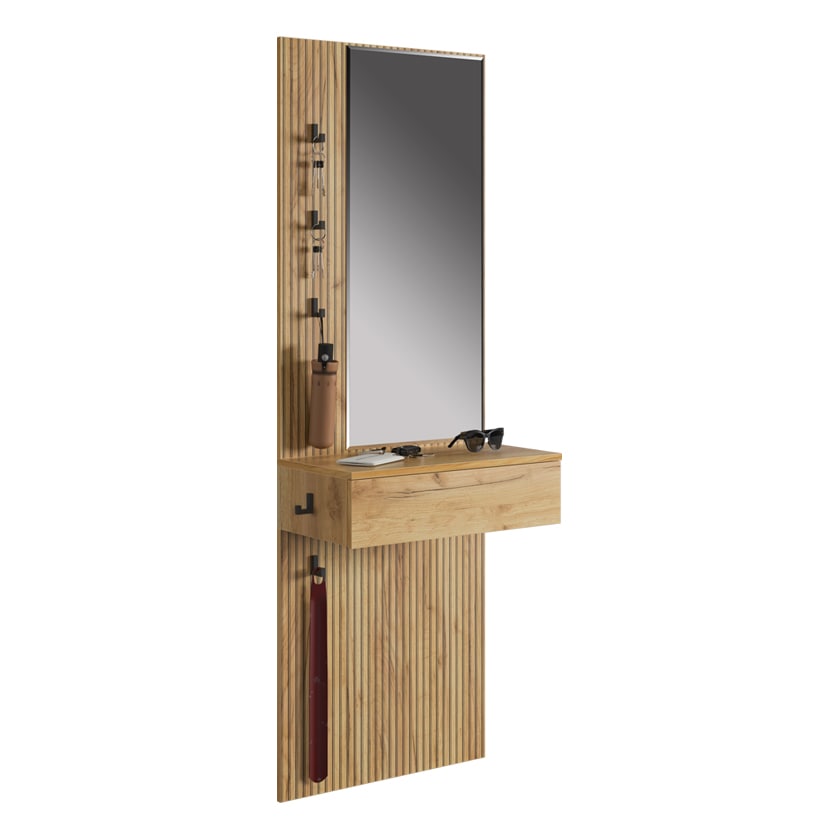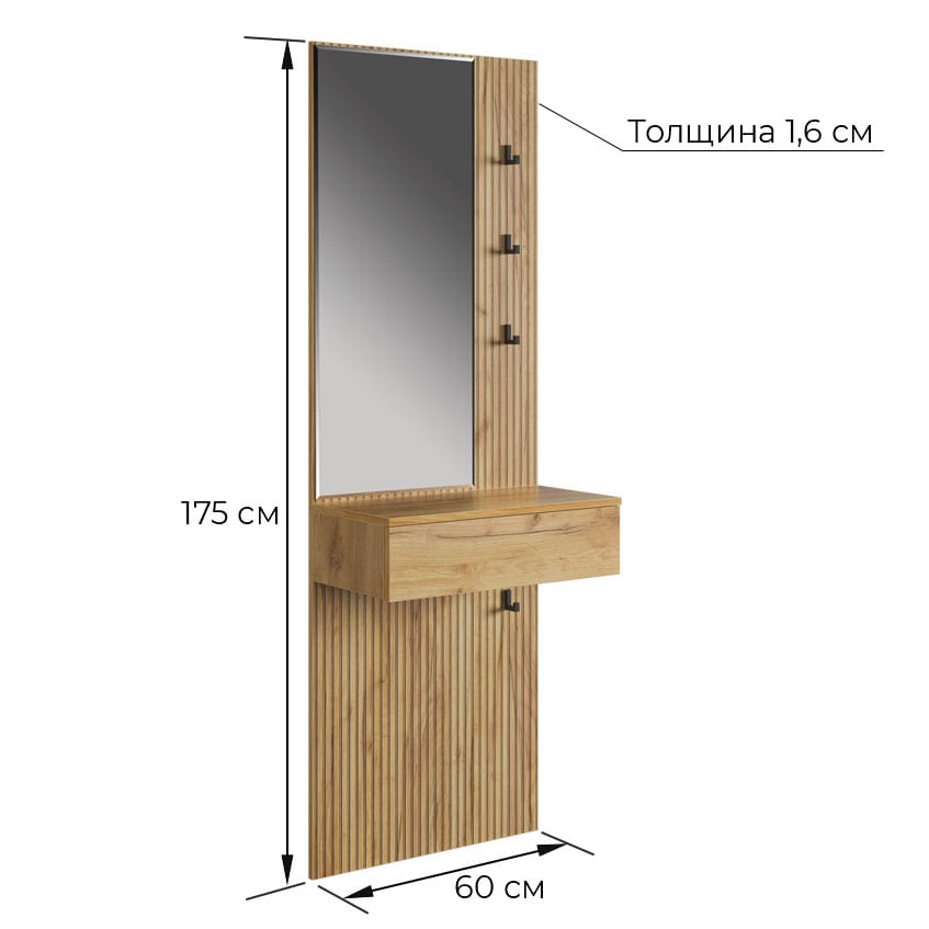 Принт, имитирующий вертикальную фрезеровку, придает зеркалу уникальный и современный вид, добавляя текстуру и глубину. Материал каркаса – ЛДСП, что обеспечивает прочность и долговечность, а также легкость в уходе.