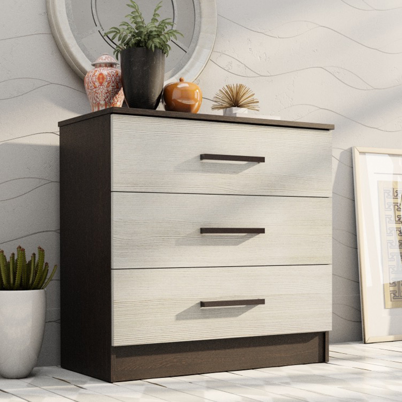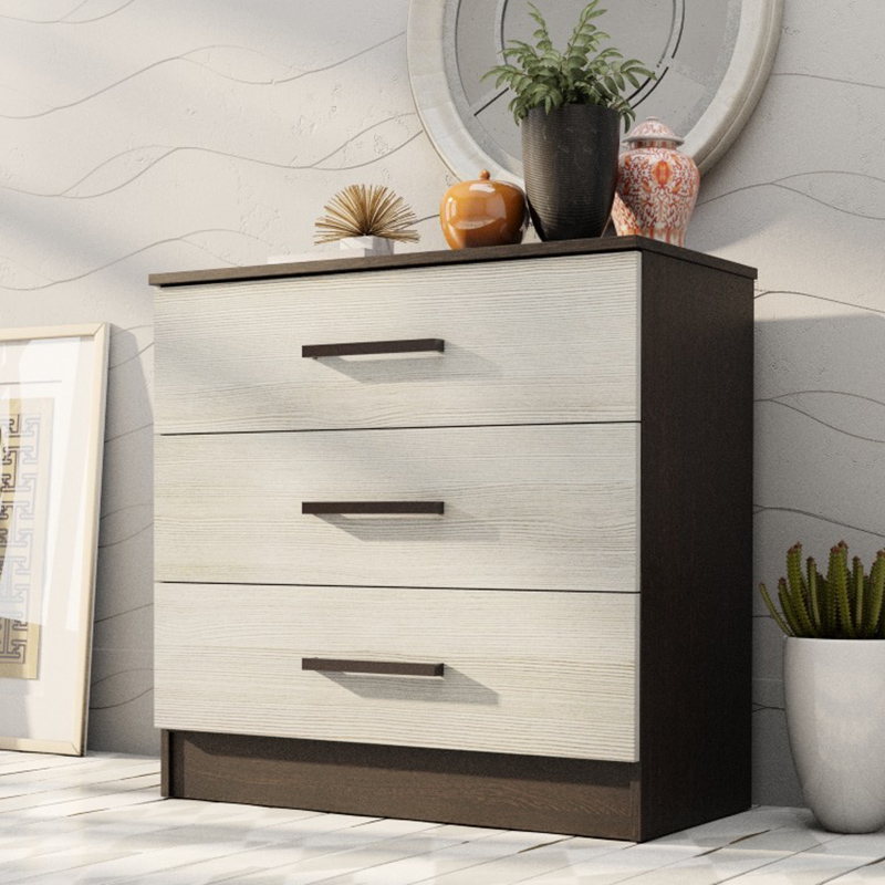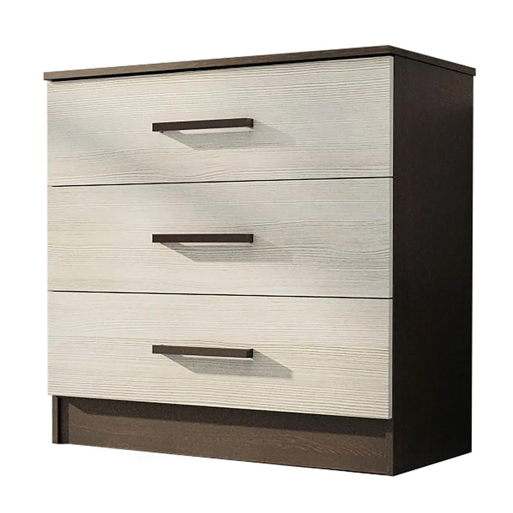 Комод оснащен тремя ящиками, что обеспечивает достаточное пространство для хранения различных предметов.