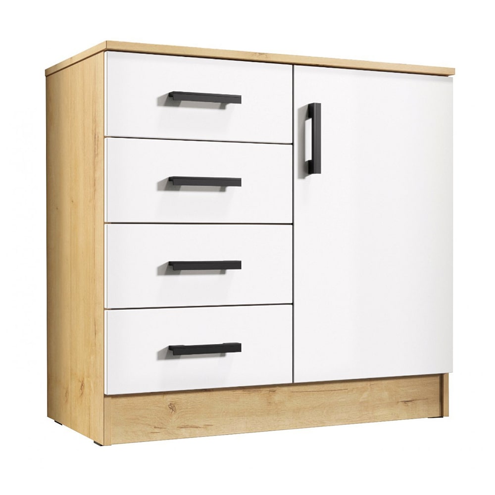 Высота комода составляет 83 см, ширина – 80 см, глубина – 44 см. Материал корпуса и фасада – ЛДСП, что гарантирует прочность и долговечность изделия. Покрытие корпуса и фасада выполнено в матовом исполнении, что придает комоду эстетичный вид и защищает его от повреждений.