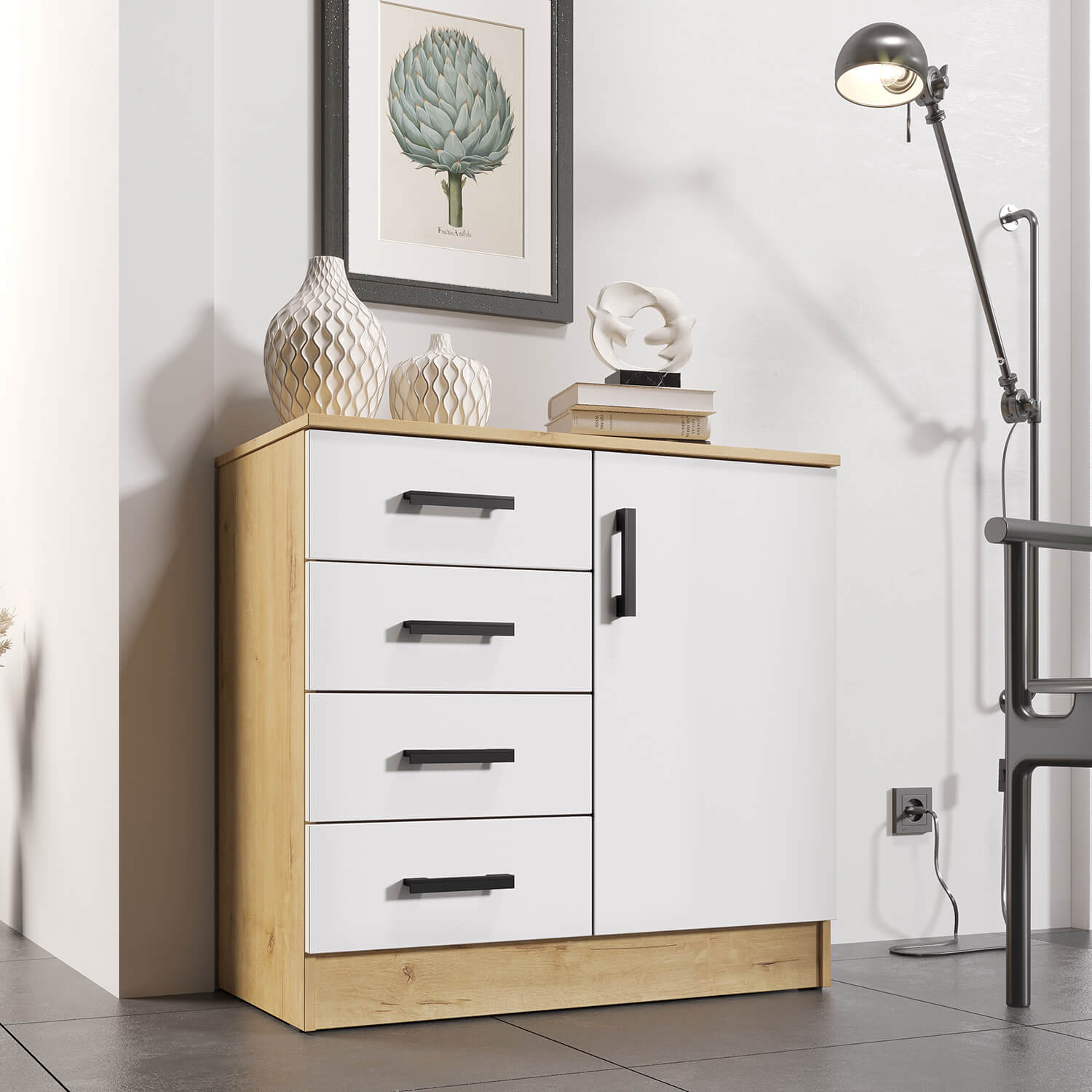 Комод оснащен четырьмя ящиками, что позволяет удобно разместить все необходимые вещи. Тип направляющих – роликовый, что обеспечивает плавное и бесшумное открывание ящиков.